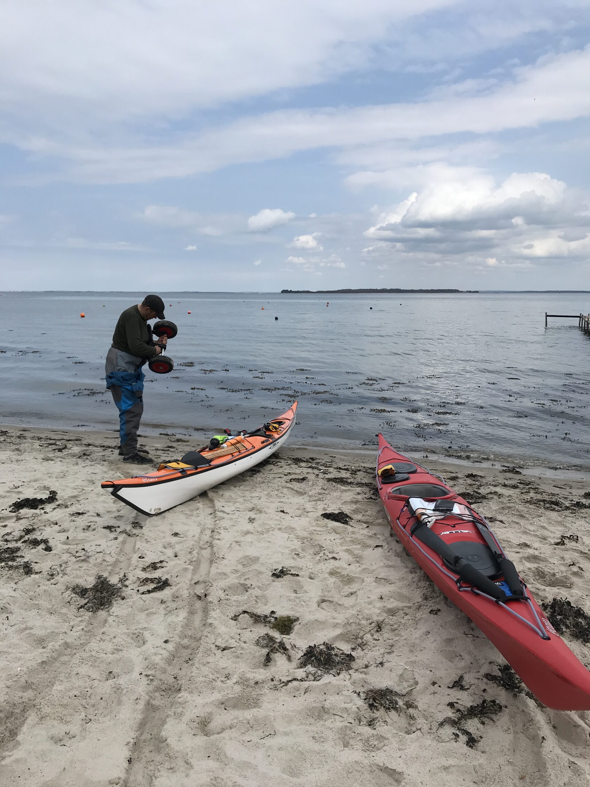 Vi fandt et godt sted at sætte i vandet ved et sommerhusområde, Sandervig. Der var en parkeringsplads ca. 500 meter fra vandkanten, så vi fik pakket kajakkerne og trak dem ned på vogne.