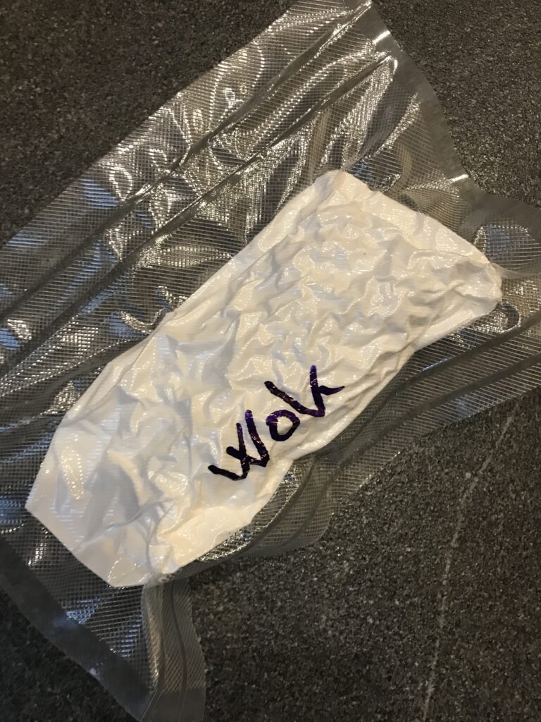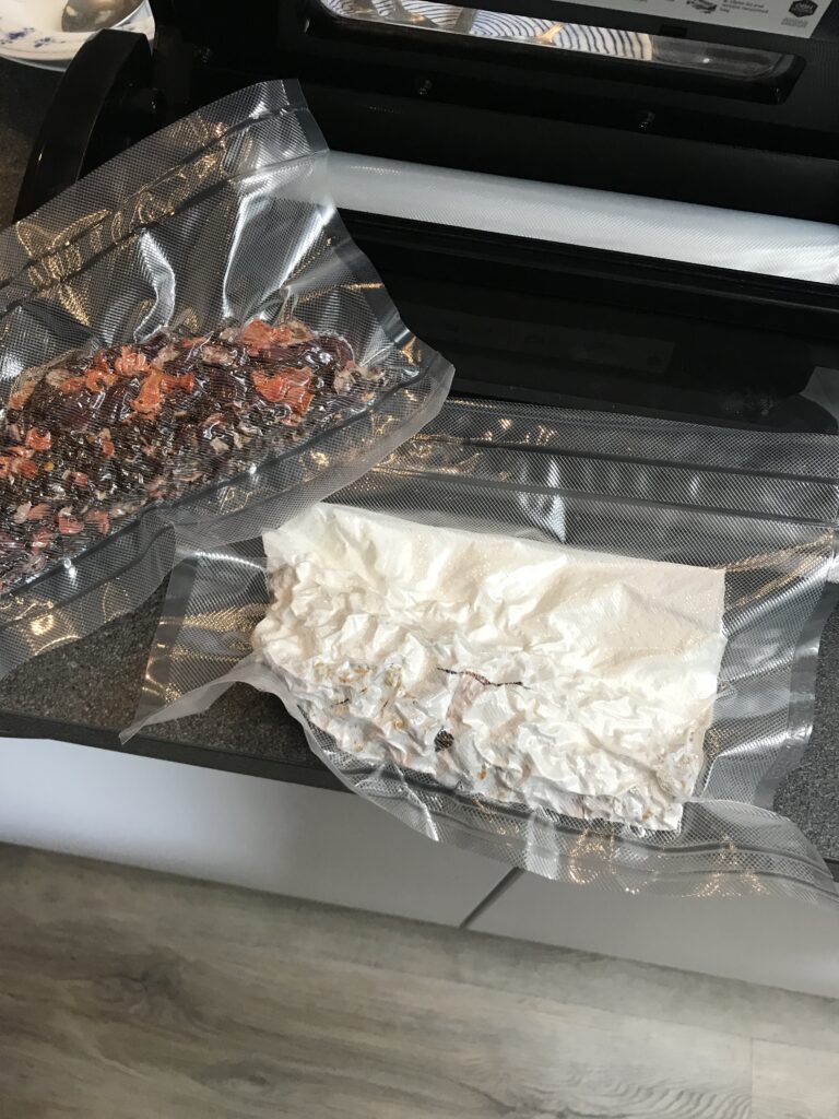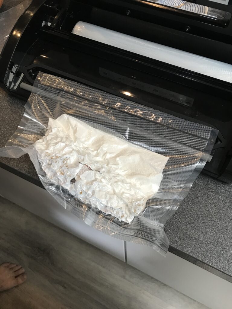 Når ingredienserne er færdige pakker vi dem i køkkenrulle eller en stor serviet. Dette for at undgå at skarpe kanter fra grønsagerne skal ødelægge vakuumforpakningen.