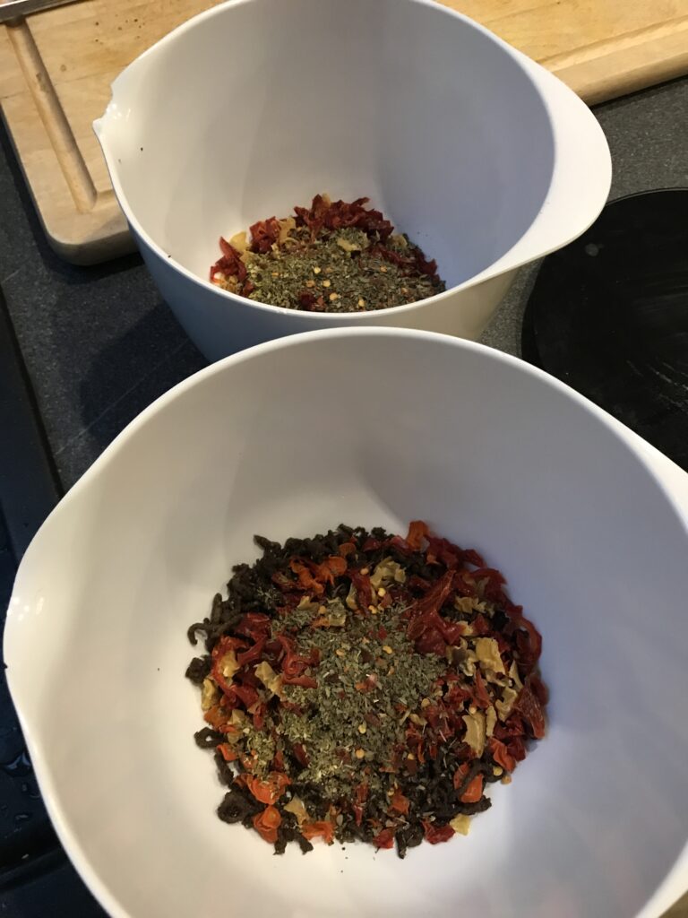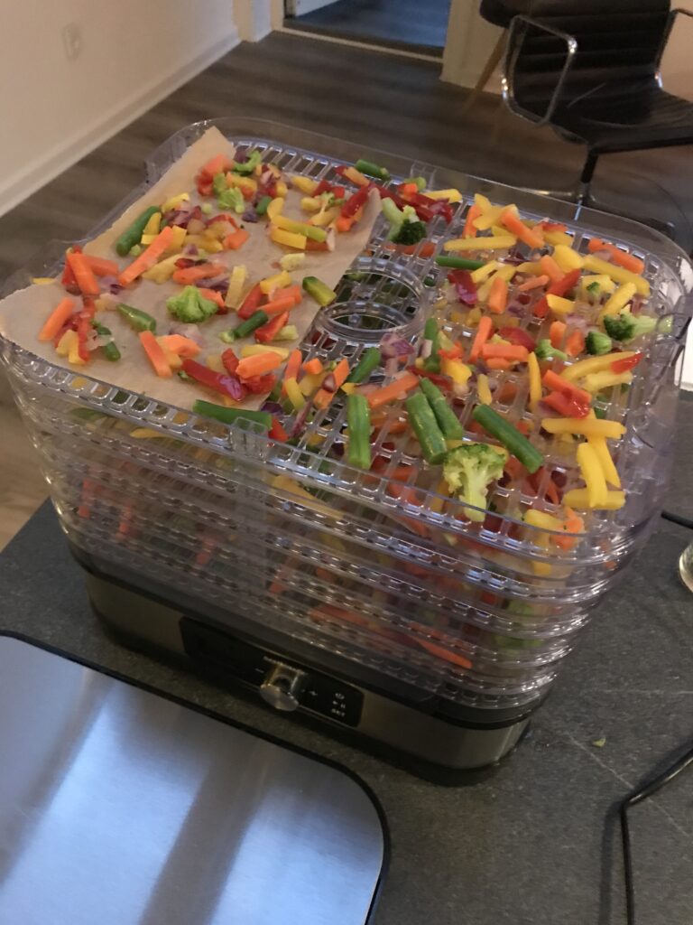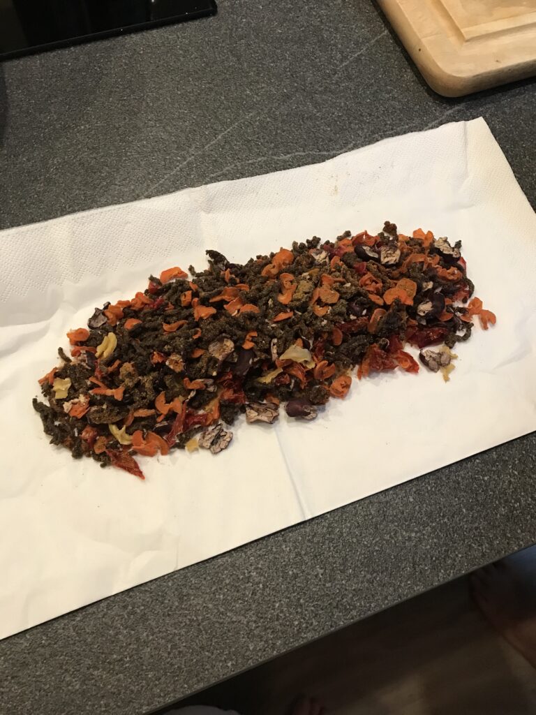 Vi har bestemt os for at teste retterne af herhjemme… vi har tørret grønsager på forskellig vis – grønsager vi selv har ordnet og blancheret, grønsager på pose, kylling marineret og stegt i ovnen, derefter skåret op og tørret. Hakket kød som er stegt på panden, med og uden krydderier og derefter tørret.