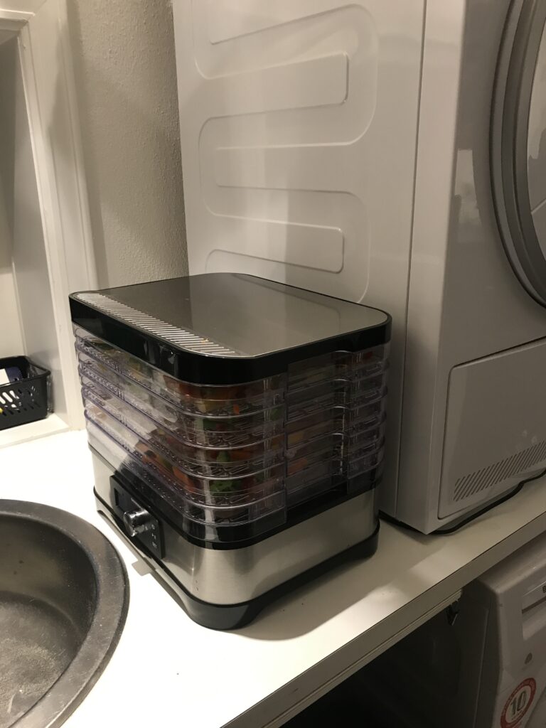 Hvis vi skulle gøre noget om, eller modificere noget, ville det være at få bakker med mindre huller… Vi kiggede meget på størrelse af bakkerne, antal af bakker, hvor meget strøm dehydratoren bruger og om der var timer og flere muligheder for temperatur, da vi valgte dehydrator. De fås endvidere i mange forskellige prisklasser – fra nogle hundrede kroner til flere tusind kroner. En jungle. Men altså et godt råd herfra – kig også på hvor store hullerne i bakkerne er! For når man dehydrerer skal emnerne jo være ret små for at sikre et godt resultat, dette harmonerer ikke godt med store huller 🙁 Så vi bruger altså bagepapir.