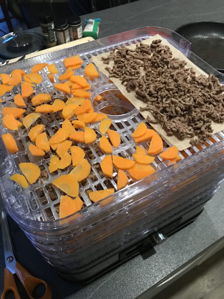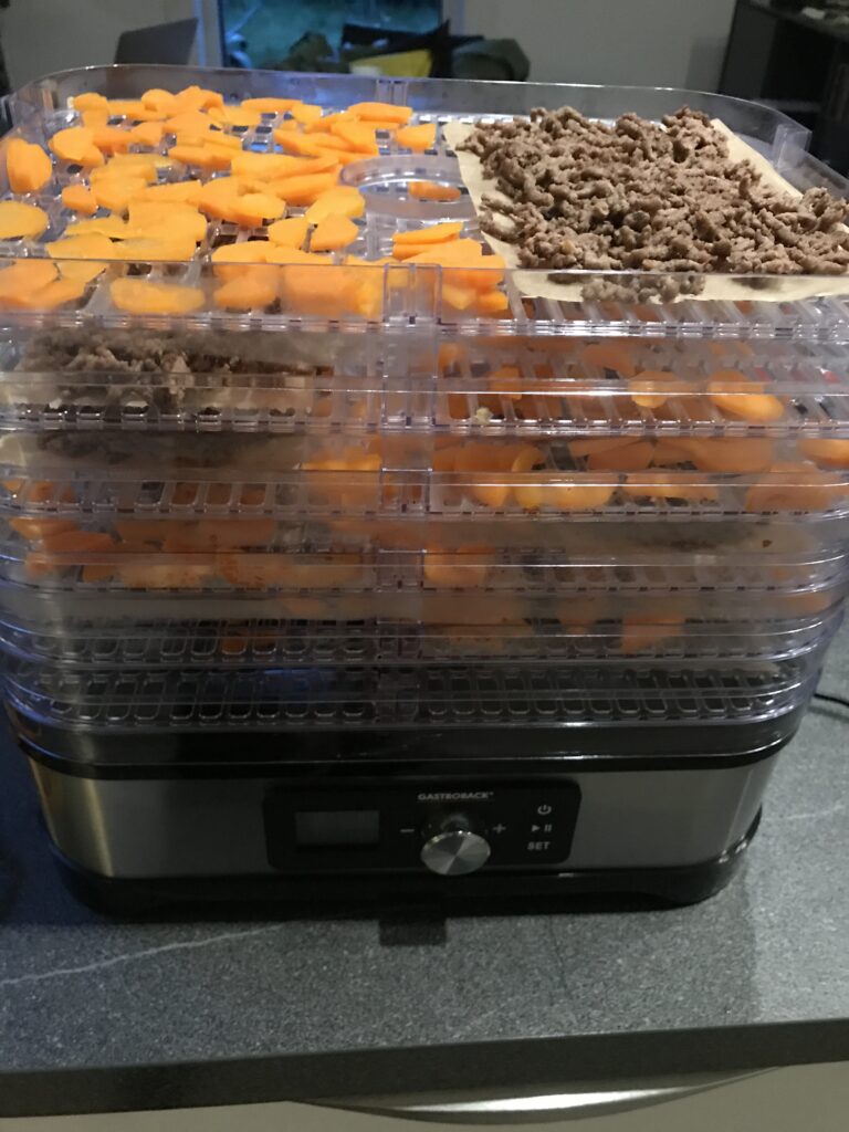 Vi har godt gang i en turnus, hvor vi forbereder 1 bakke kød og for eksempel 4 gulerødder og dehydrerer dette over natten (ca. 12 timer ved 70 grader) og så laver vi endnu en portion om morgenen og så fremdeles.