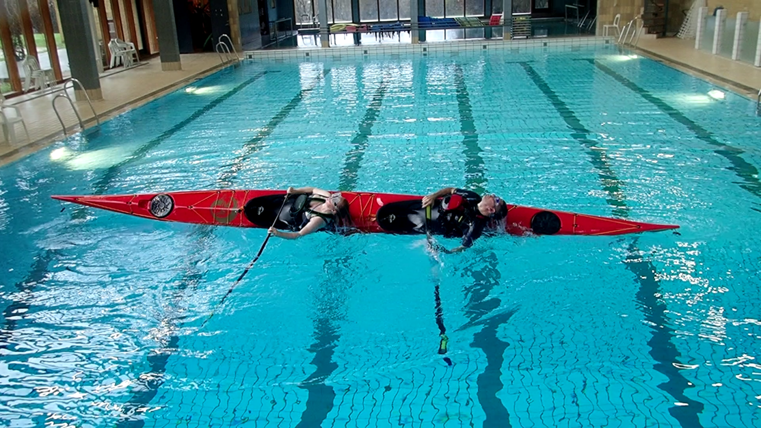 Vores nye dobbeltkajak skulle afprøves i svømmehallen. Det er virkelig sjovt at ro sådan en – og rulle sådan en 🎉