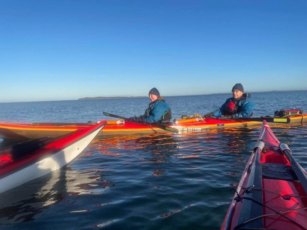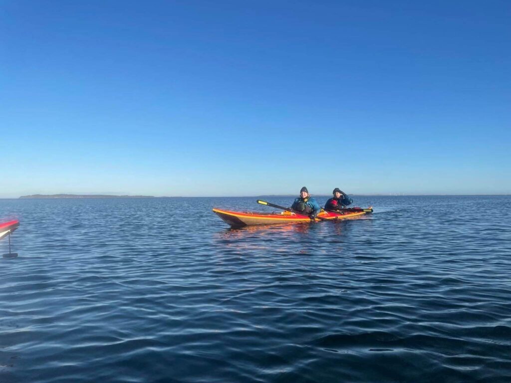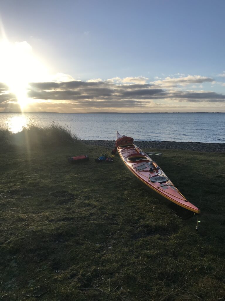 Vejret er flot. Vinden er fin og vi har testet dobbeltkajakken i svømmehallen. Det er dog lidt noget andet at pakke en dobbeltkajak, når der stadig skal være plads til både vintersoveposer og hovedpuder 😉 men det gik og vi stævner ud fra Anshede ved Fur Bryghus. Dette for at få vinden i ryggen.