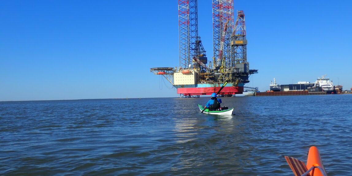 Det er endnu en smuk solskinsdag i marts og vi har bestemt os for at øve lidt padling i strøm. Vi har set træningsvideoer på Online Sea Kayaking og er nu klar til at prøve teknikkerne af i praksis ved “Chokoladeknappen” i Esbjerg Havn. Vi tager færgen over og sætter i fra Esbjerg roklubs bro og roer ud forbi boreplatformene. Tidevandsstrømmen er endnu ikke taget så meget til så vi roer ud og kigger lidt på den nye lystbådehavn og sejlsportens hus, som tager form på kajen.