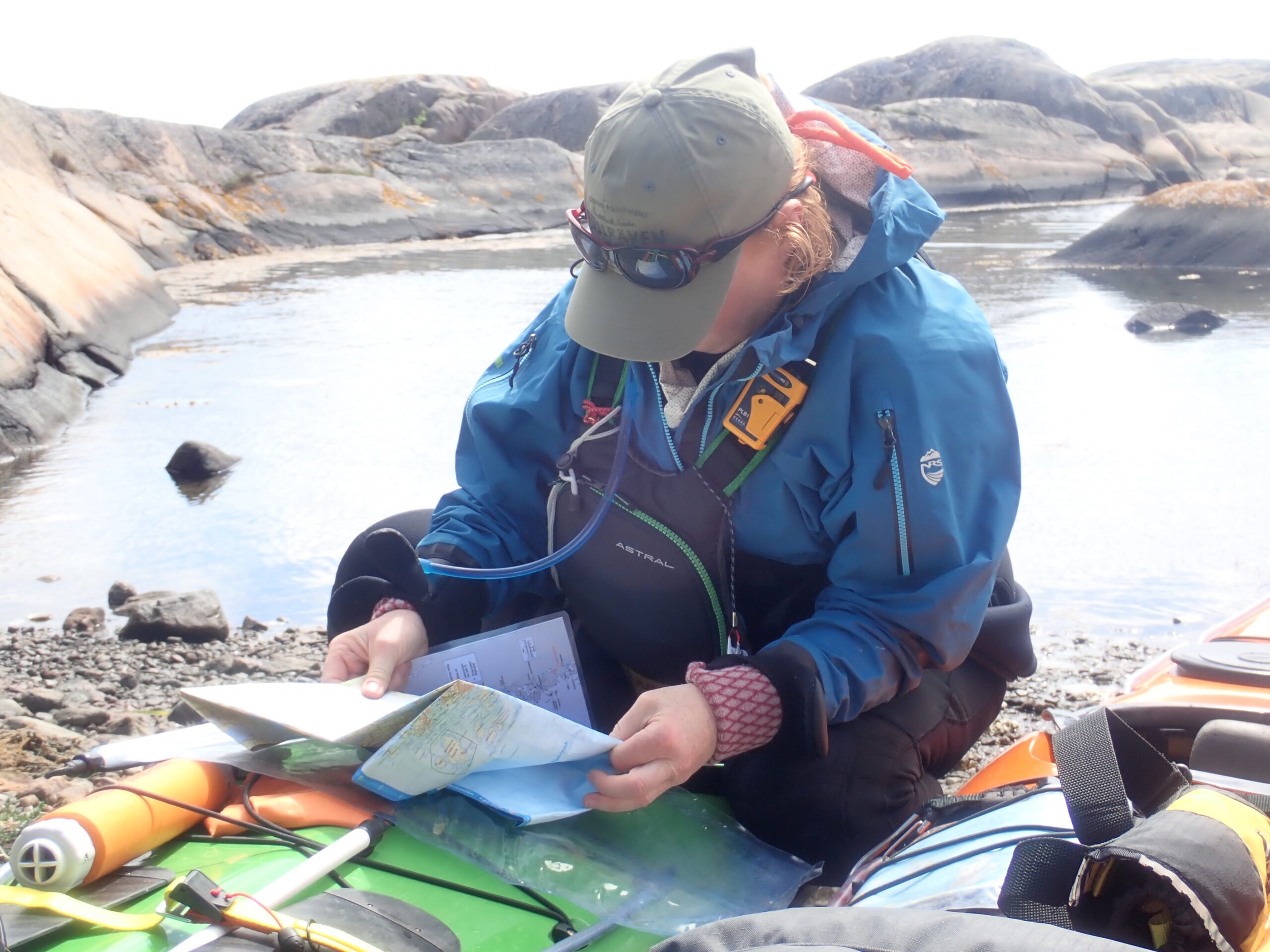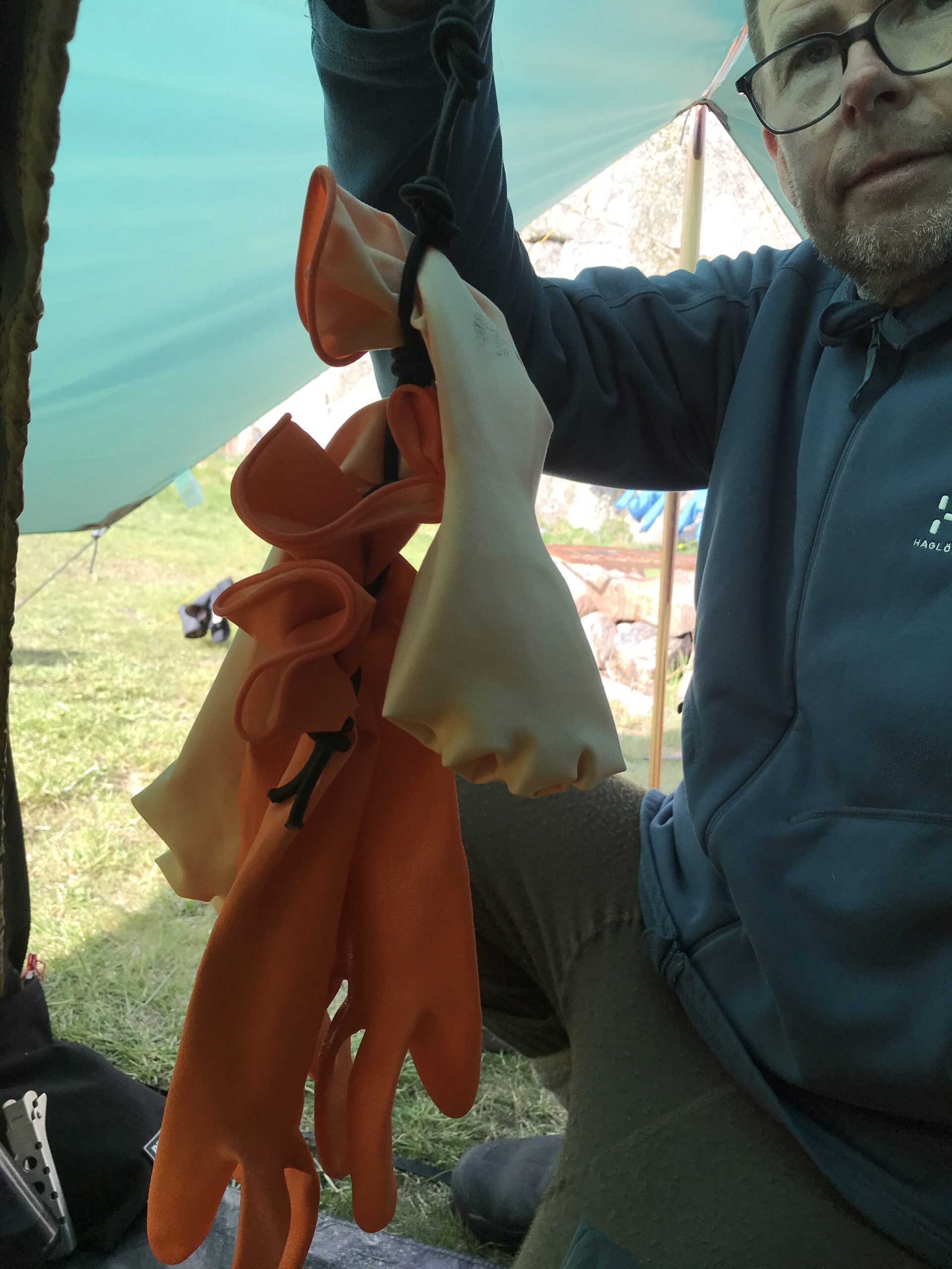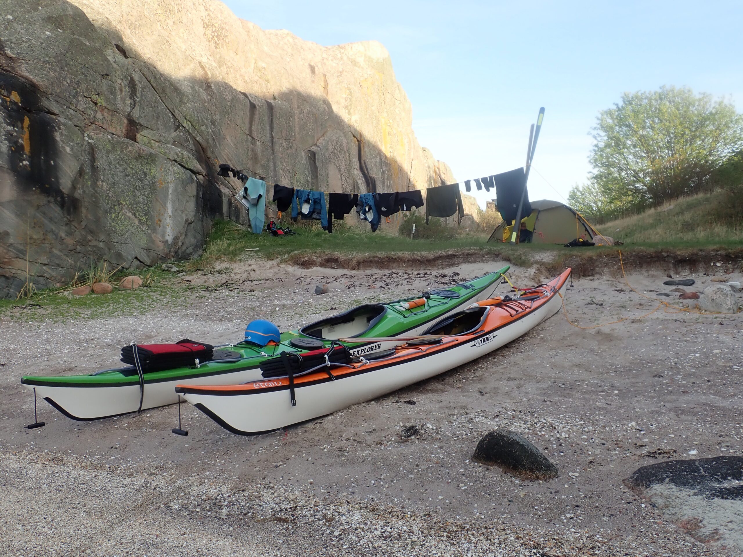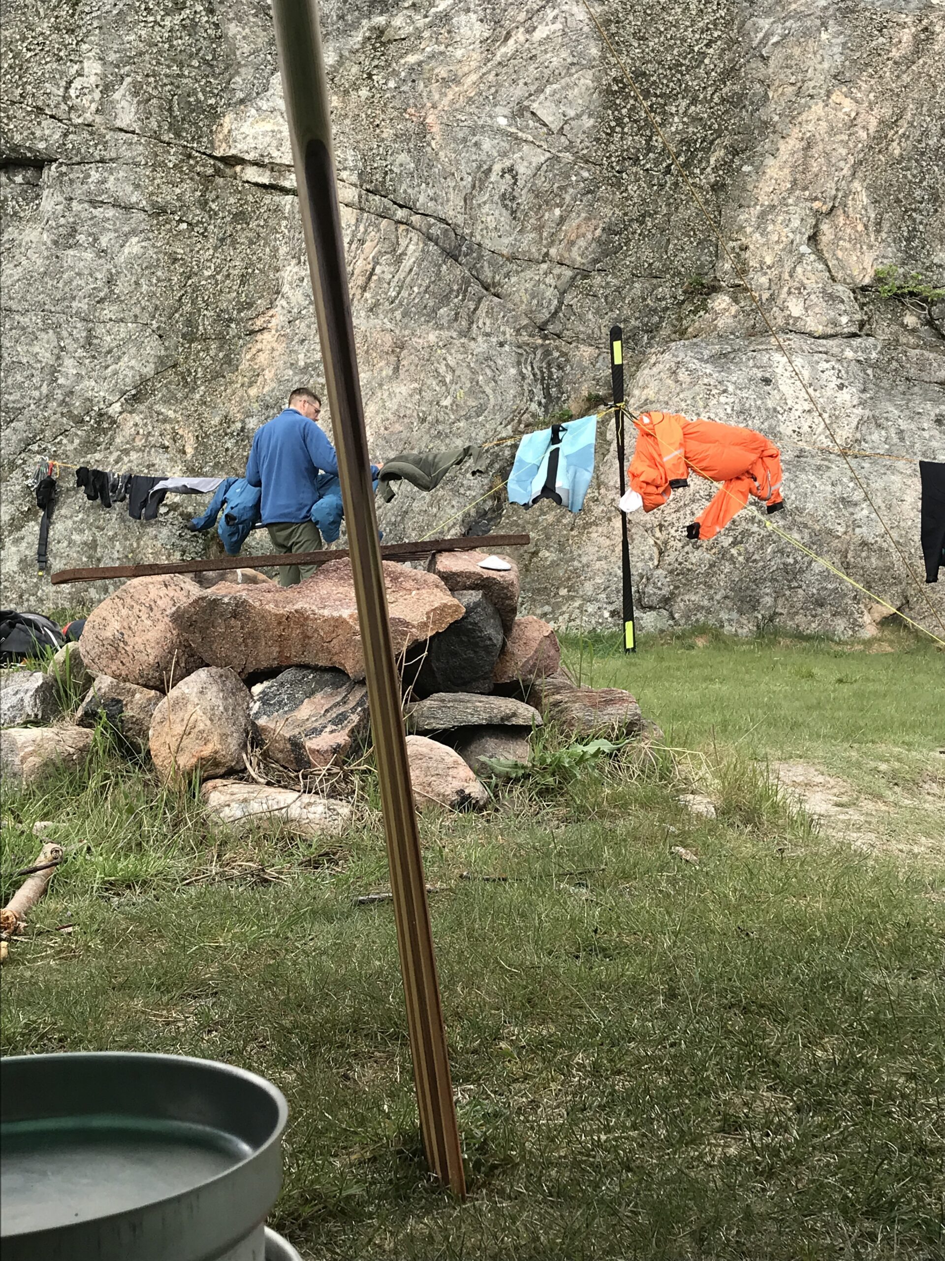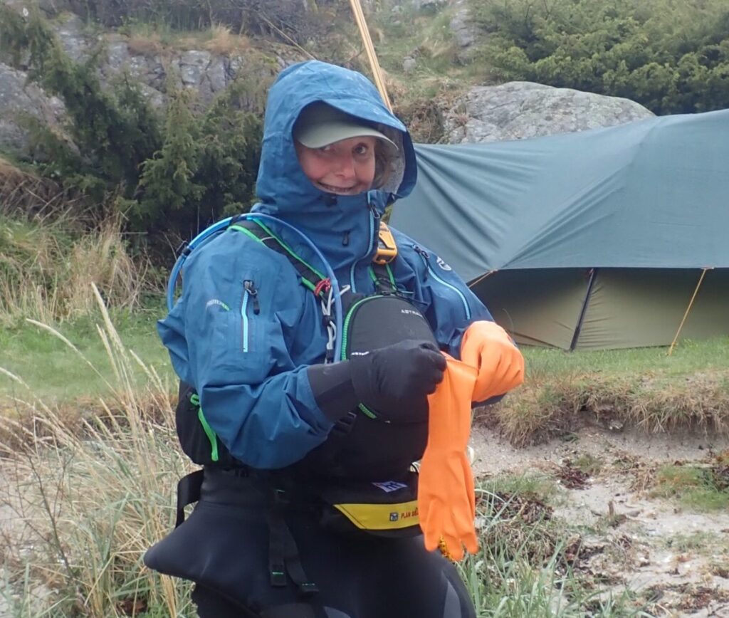 Da vi kom tilbage, fik vi en kop varm kakao i et par solstråler op af klippevæggen og Lars fik konstrueret en meget fin tørresnor af et par gamle klatrekiler (tak til CC for dem) og en åre. Der blev også udtænkt et sindigt system til gummihandskerne. Uden dem er Kristine ret presset 😉 tænker der er få kajakroere med så mange handsker og vanter som hende…. Vi forventer megen vind men ikke mere regn. Så tarpen kommer ned i aften, så den ikke larmer og presser teltet (og Lars)