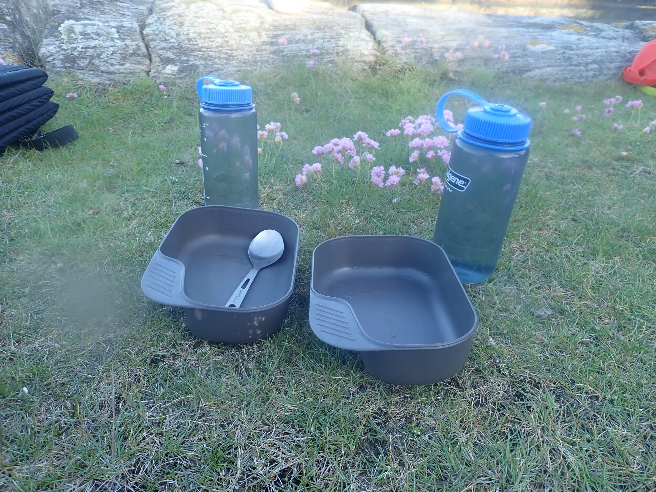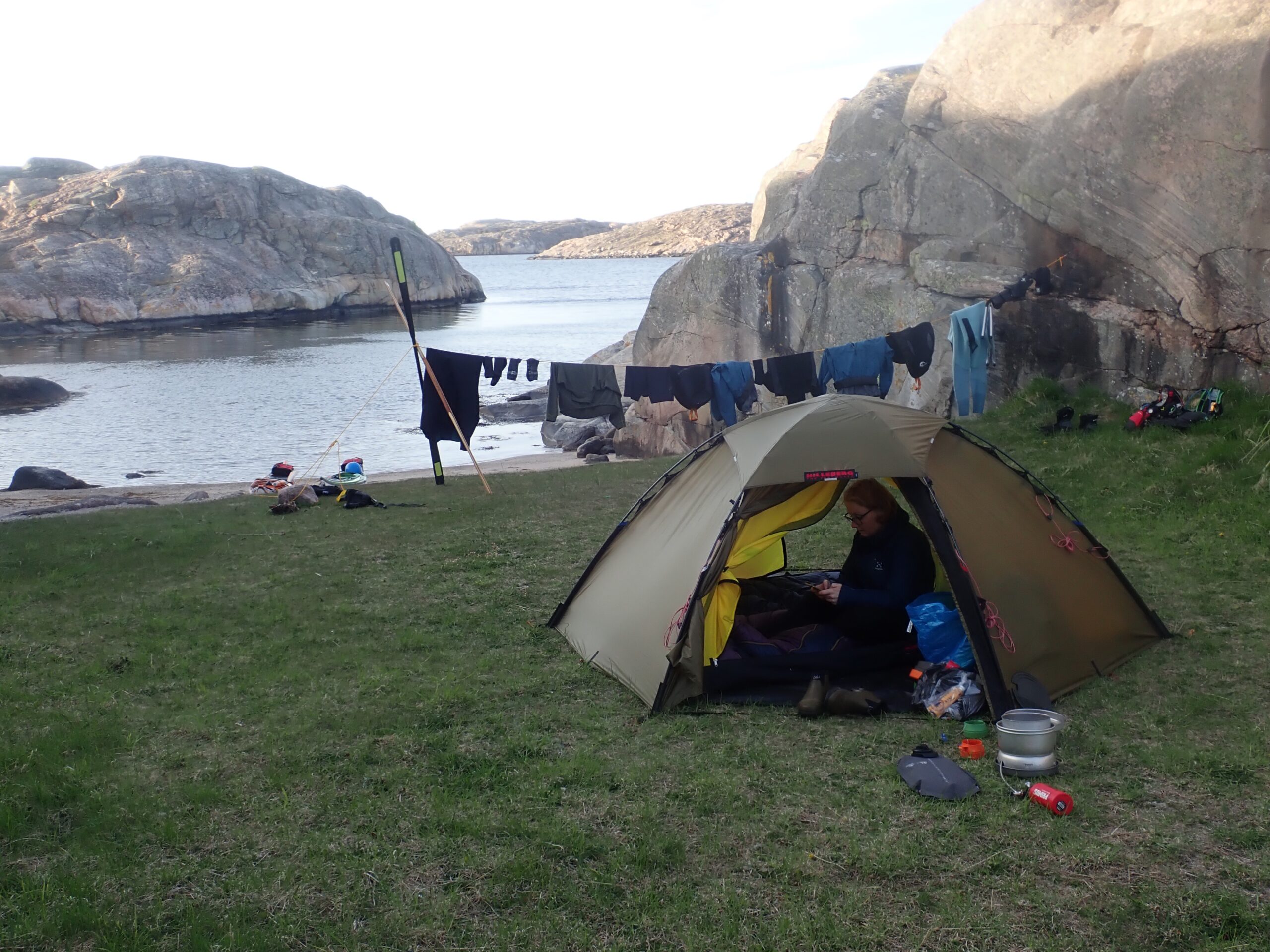 Op med en tørresnor. Det våde tøj af. Tørt på. Telt op, en kop te i solen og så i teltet med dagbog og en god bog, mens aftensmaden trækker. Vi elsker lejrlivet.