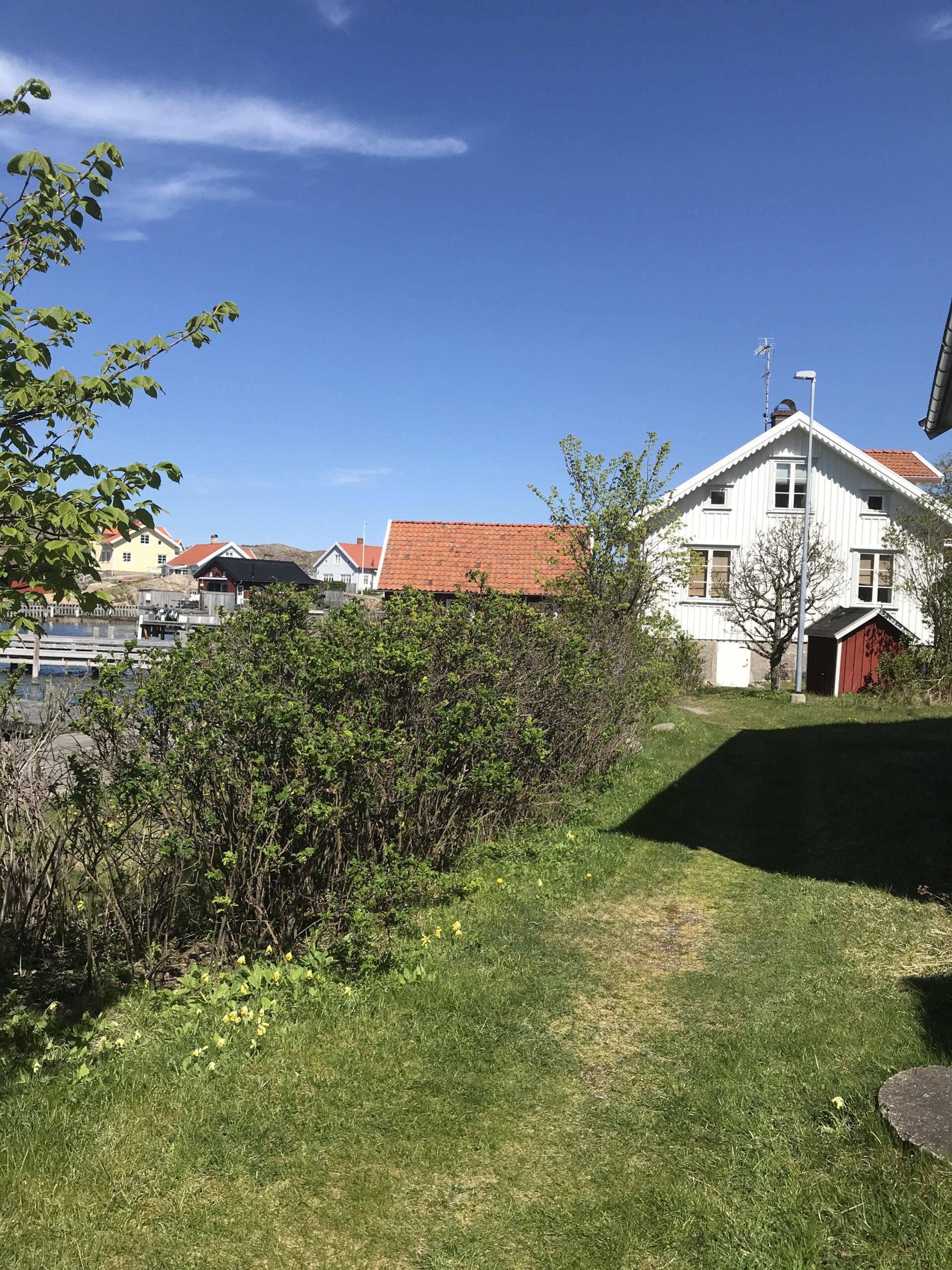 Der var igen en del modvind, men vi fandt rundt om Dyngöen og fandt en lille bugt, hvor vi kunne gå i land. Der er en del huse på øen og vist også et par fastboende, kunne vi fornemme. Der var meget smukt med gamle huse, hvidtjørn i blomst og fint passede små haver.