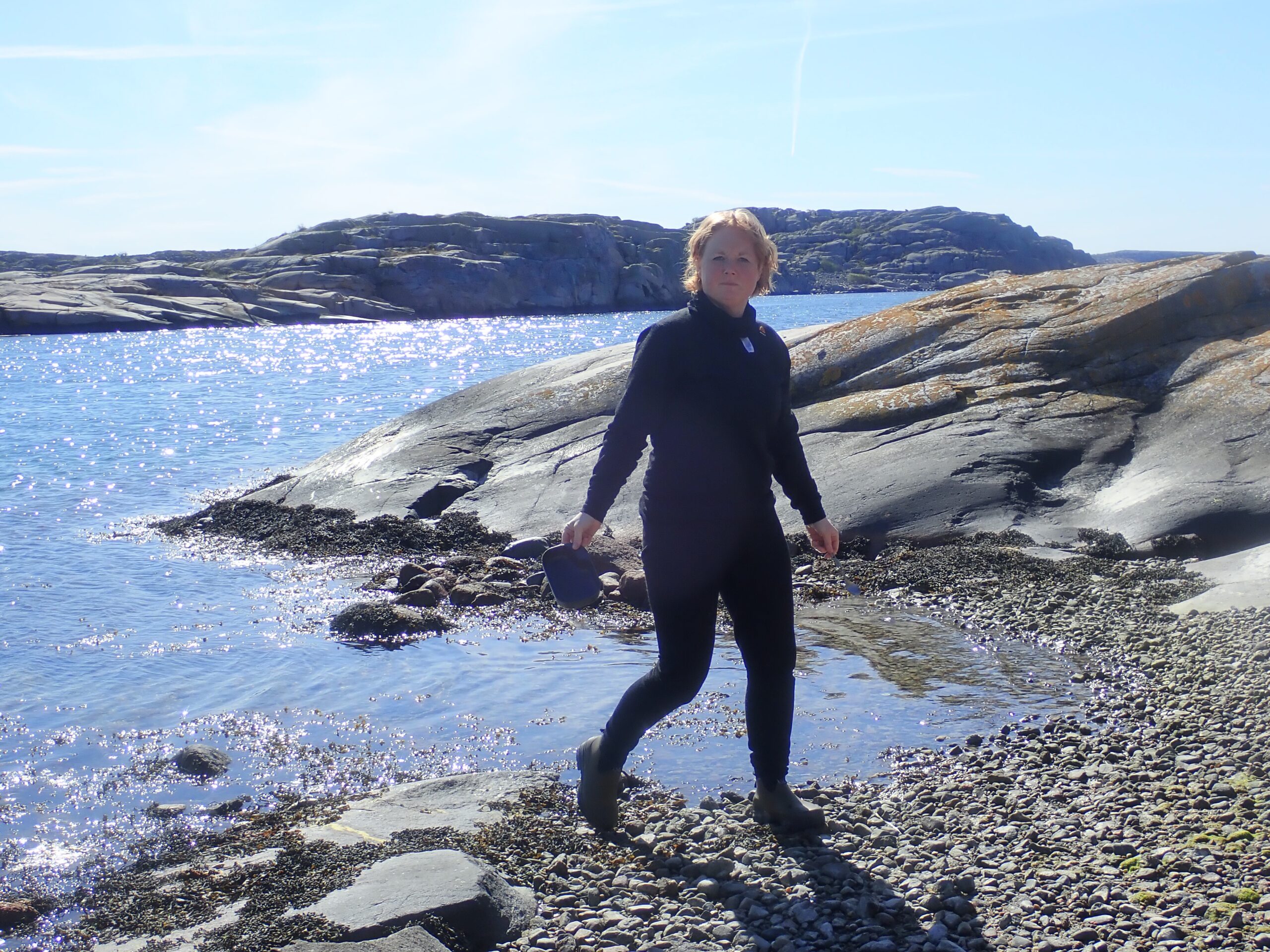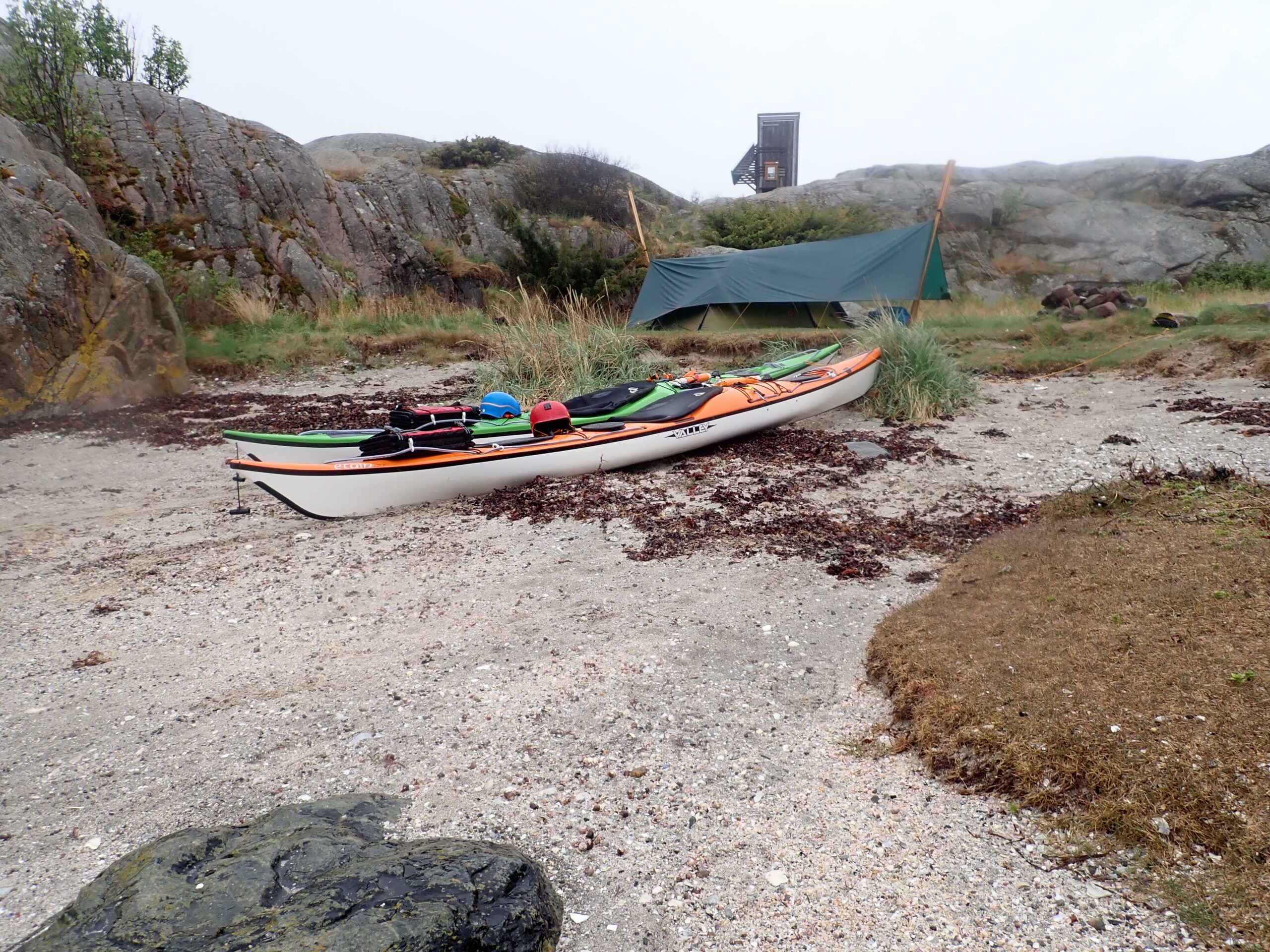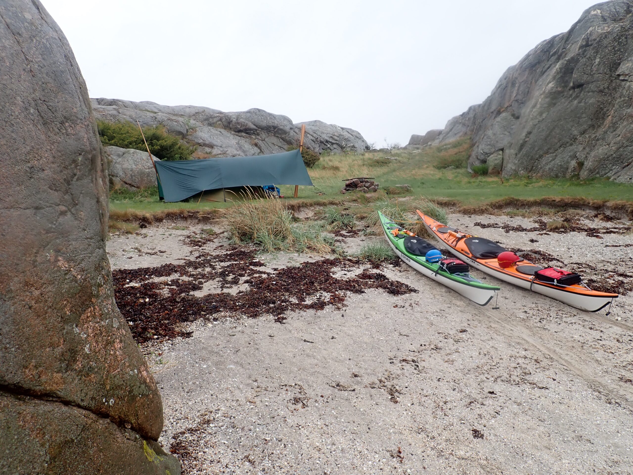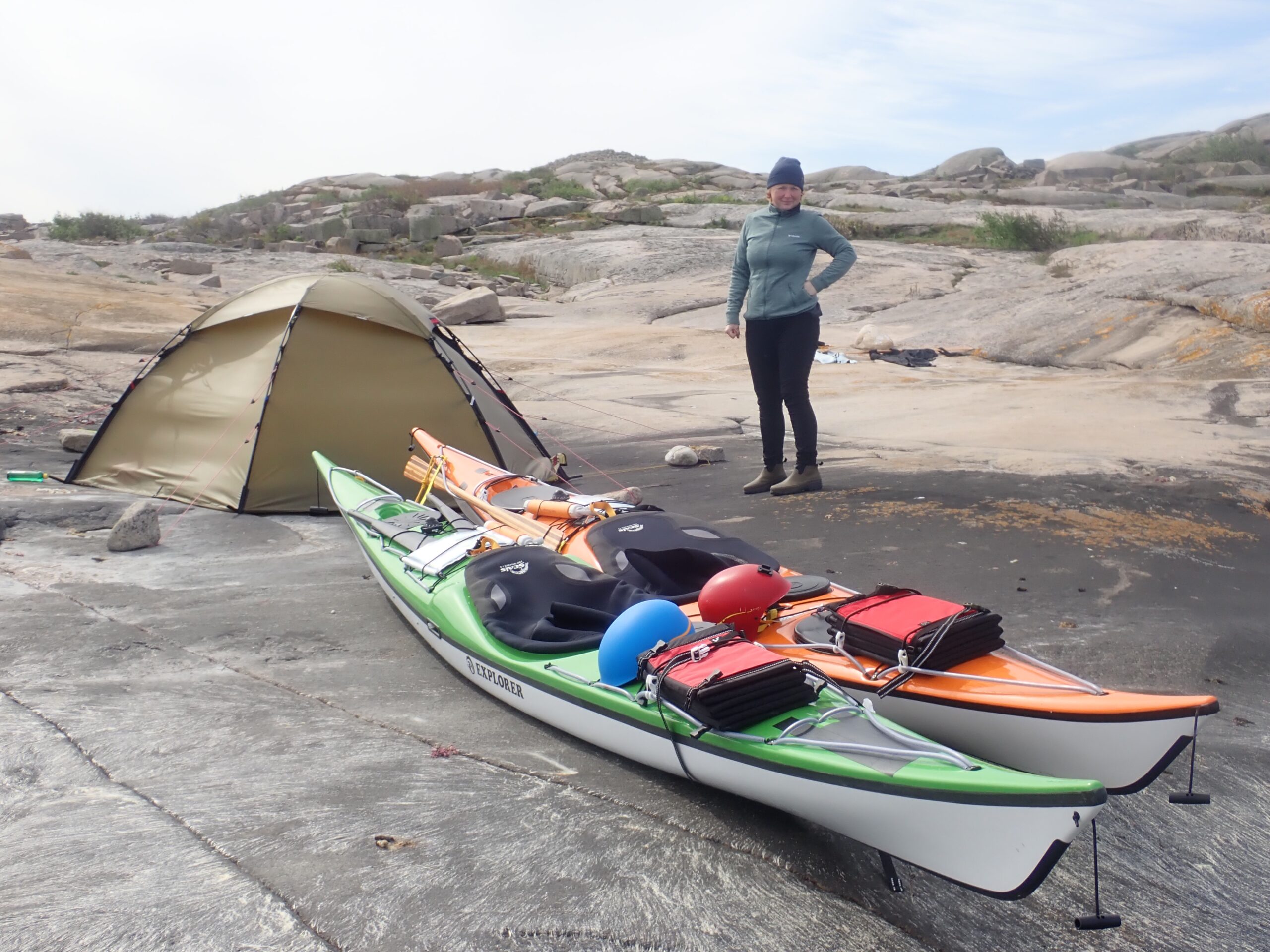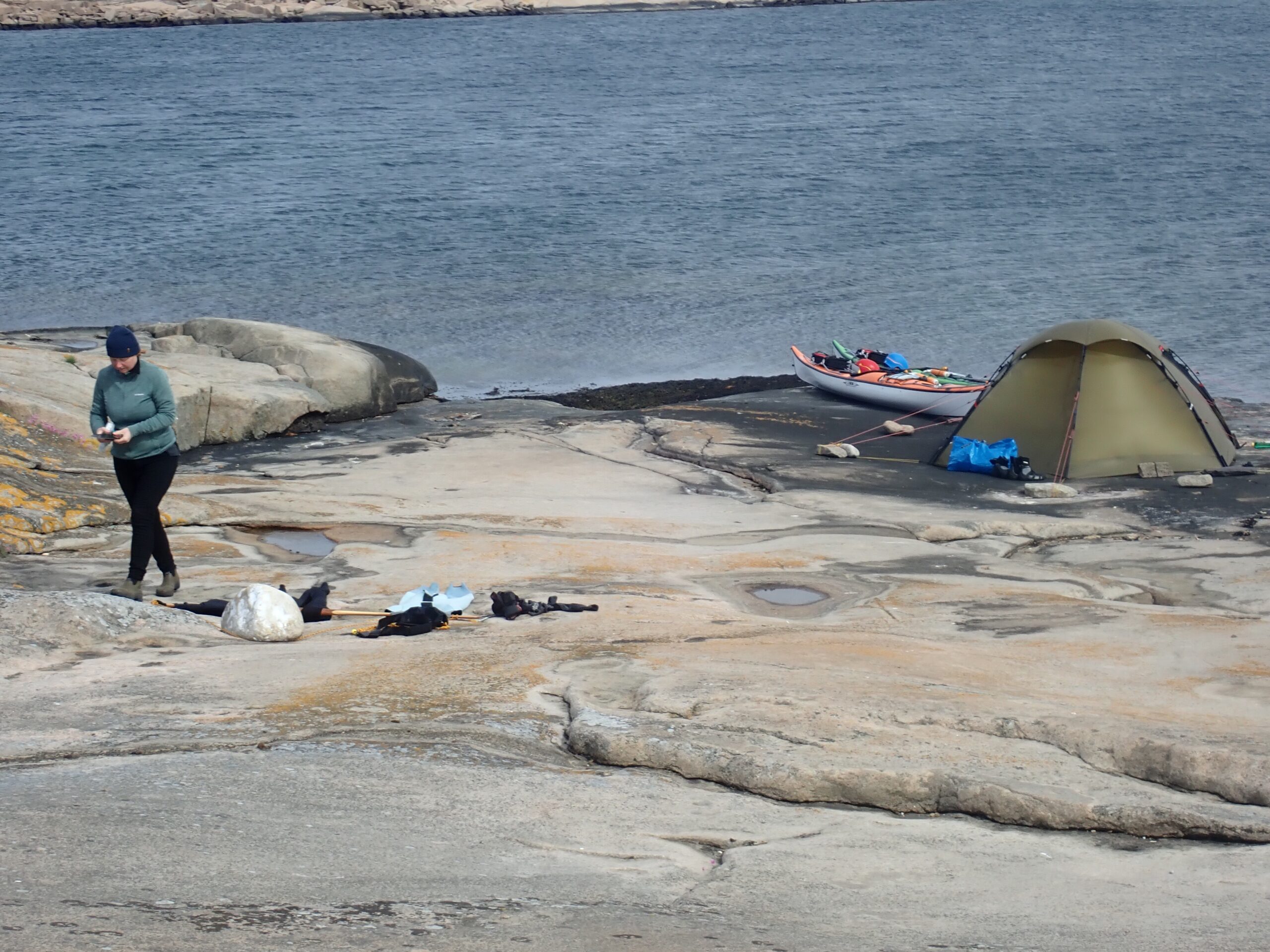 Det er absolut en rå og øde skærgård og der er ikke meget sandstrand på disse kanter. Vi endte med at trække kajakkerne op på klippen på Søndre Grötö. Her kom vores 4-i -1 paddlefloat igen i brug, så de fuldt lastede kajakker ikke led at for megen overlast på klippen.Vi fik fundet en nogenlunde plan plet på klippegrunden og fæstnet teltet med sten. Der skulle komme en del vind igen onsdag, så det var afgørende at teltet stod godt og sikkert. Det samme gjalt kajakkerne som blev fæstnet med en klatrekile.
