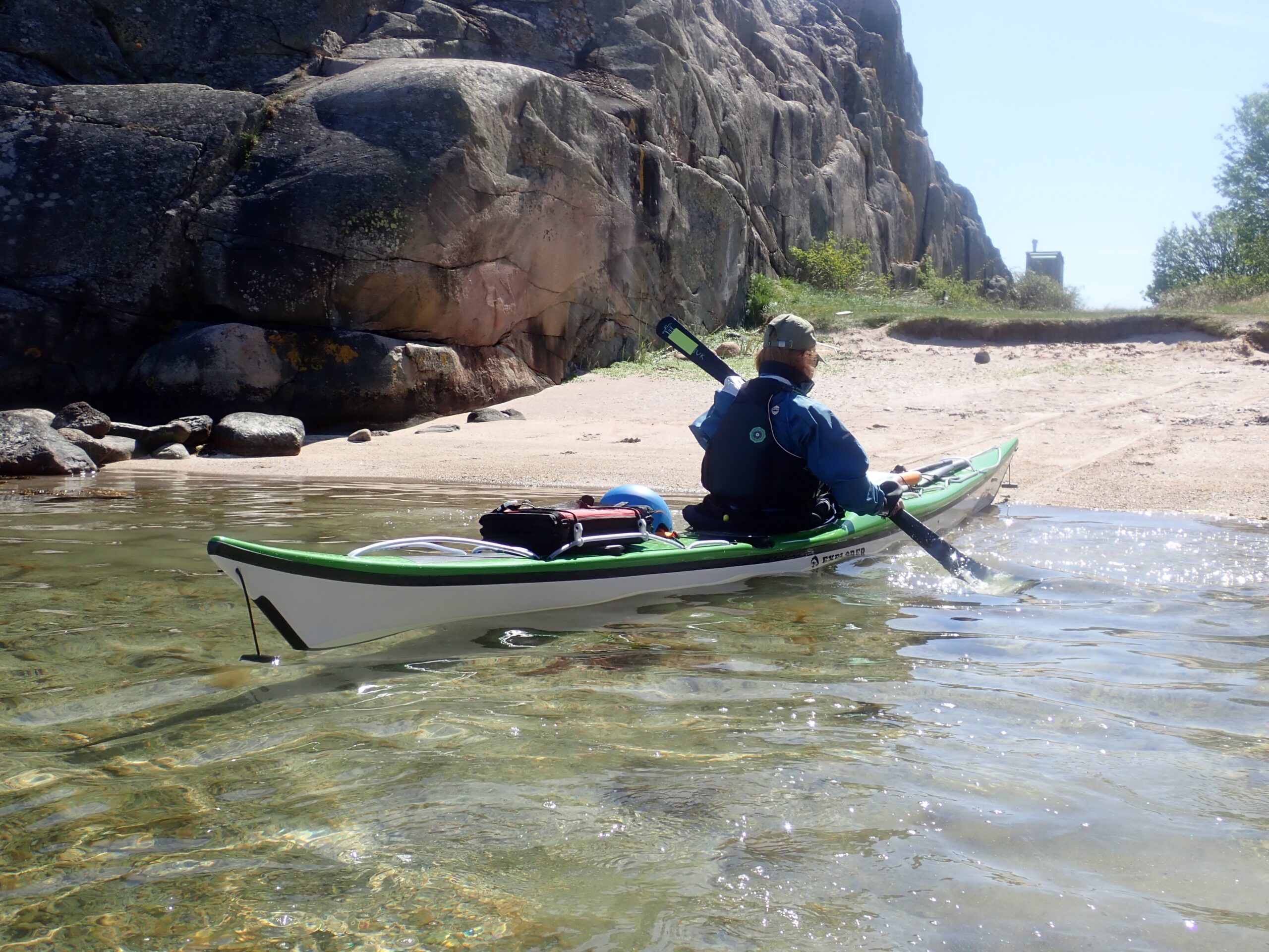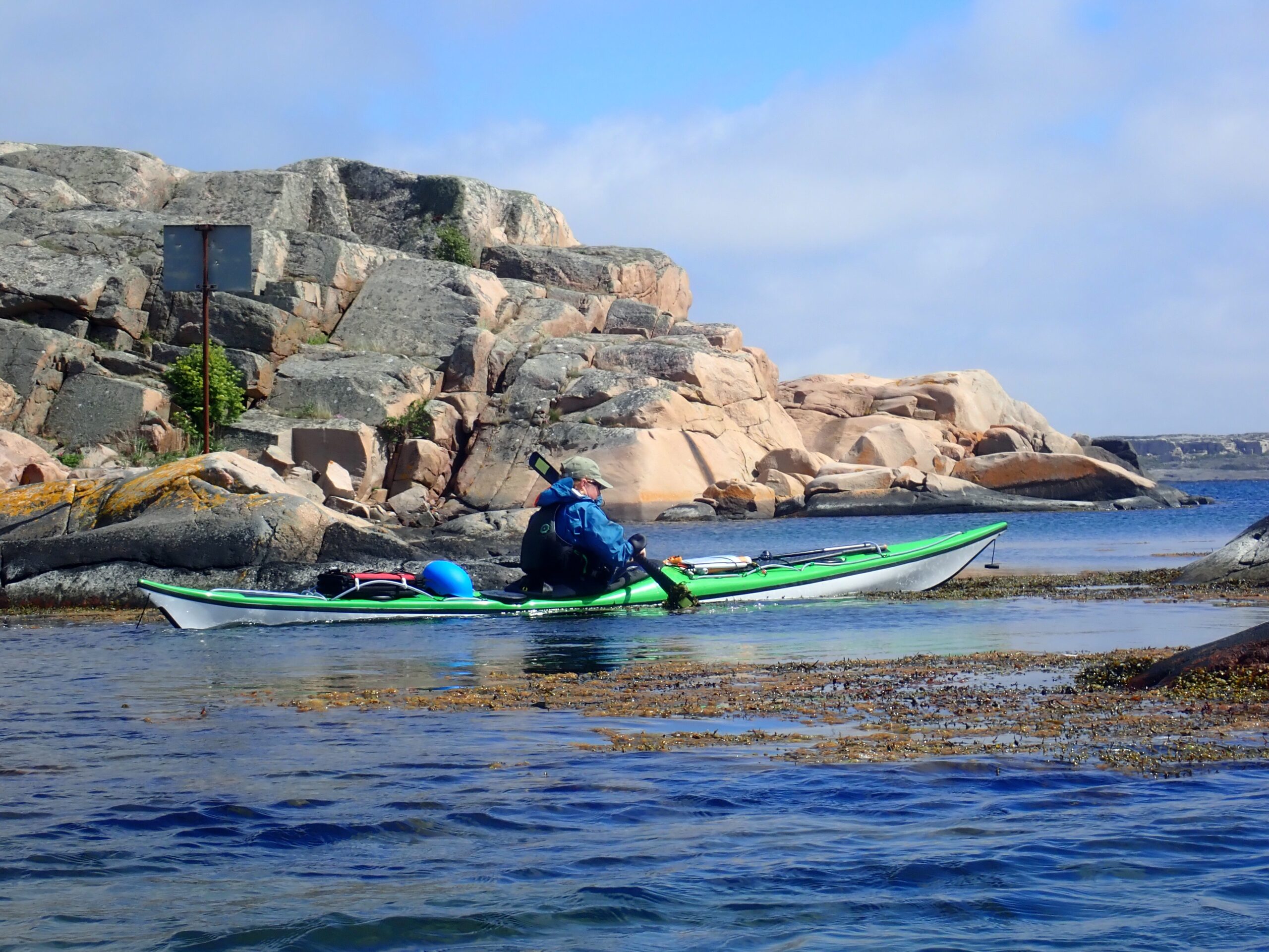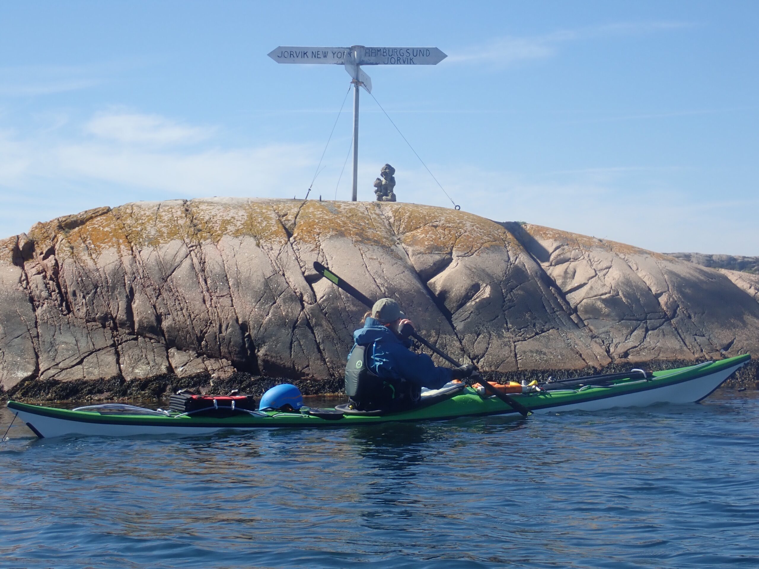 Det var super padlevejr og vinden havde lagt sig til omkring 2-4 m/sek. vi roede langs kysten og igennem smalle passager med stejle vægge. Vi stødte på et sjovt “vejskilt” ved den sydlige indsejling til Hamborgsund.