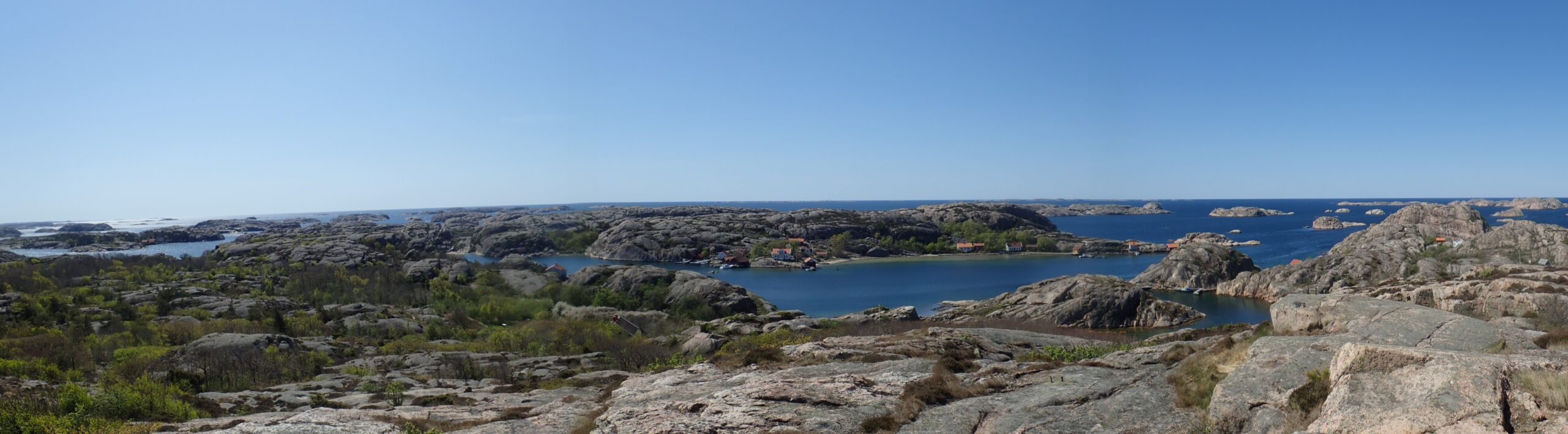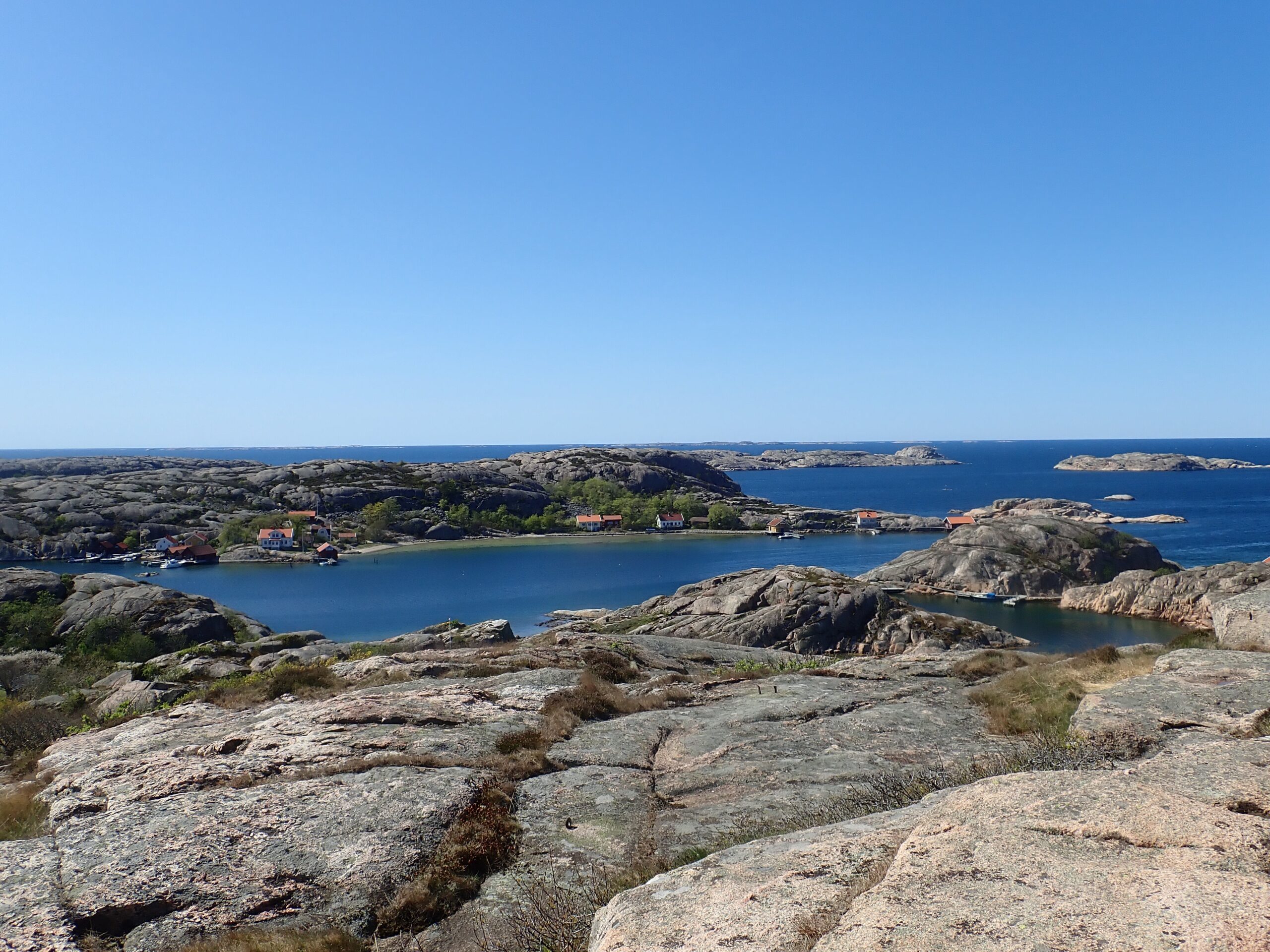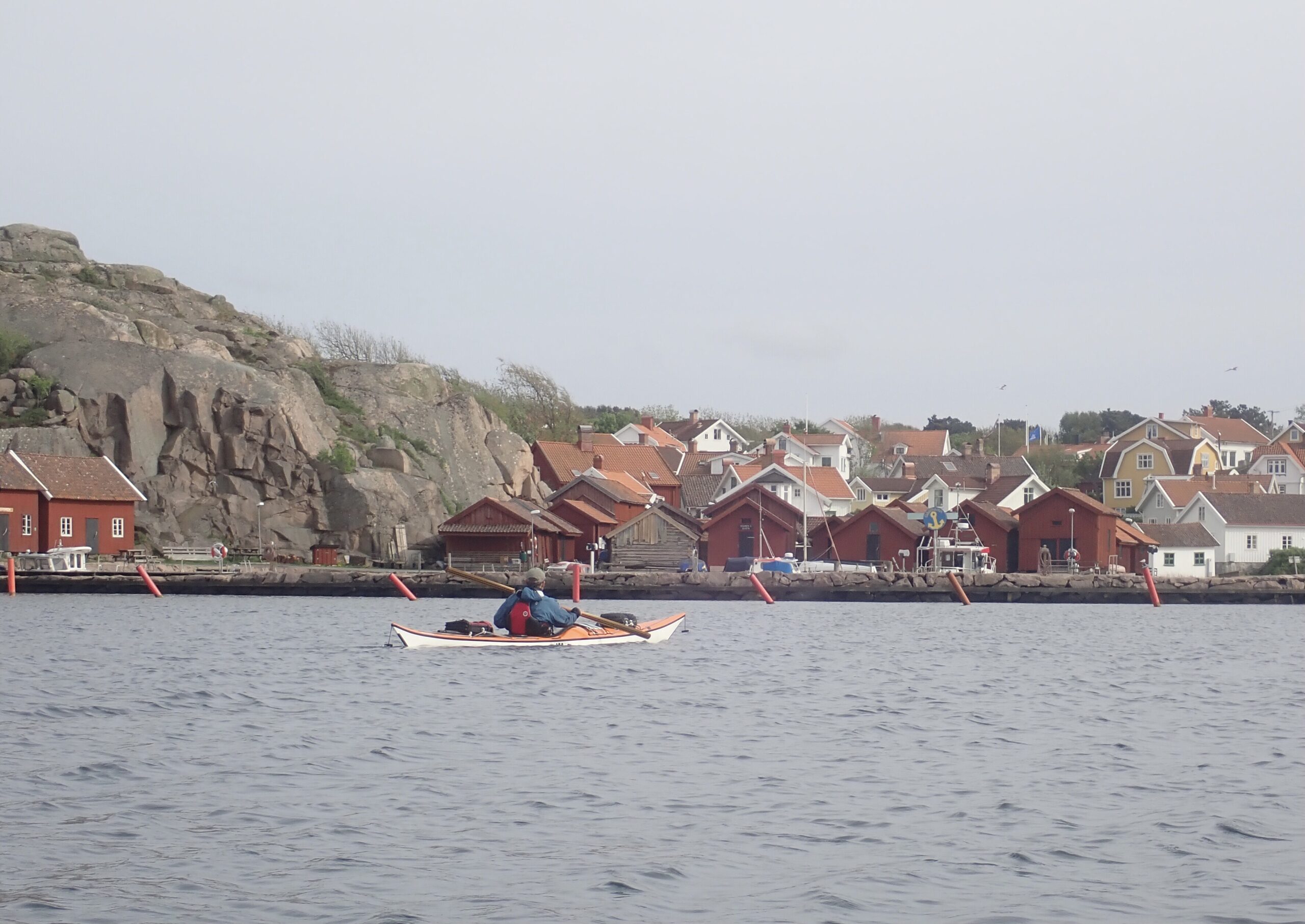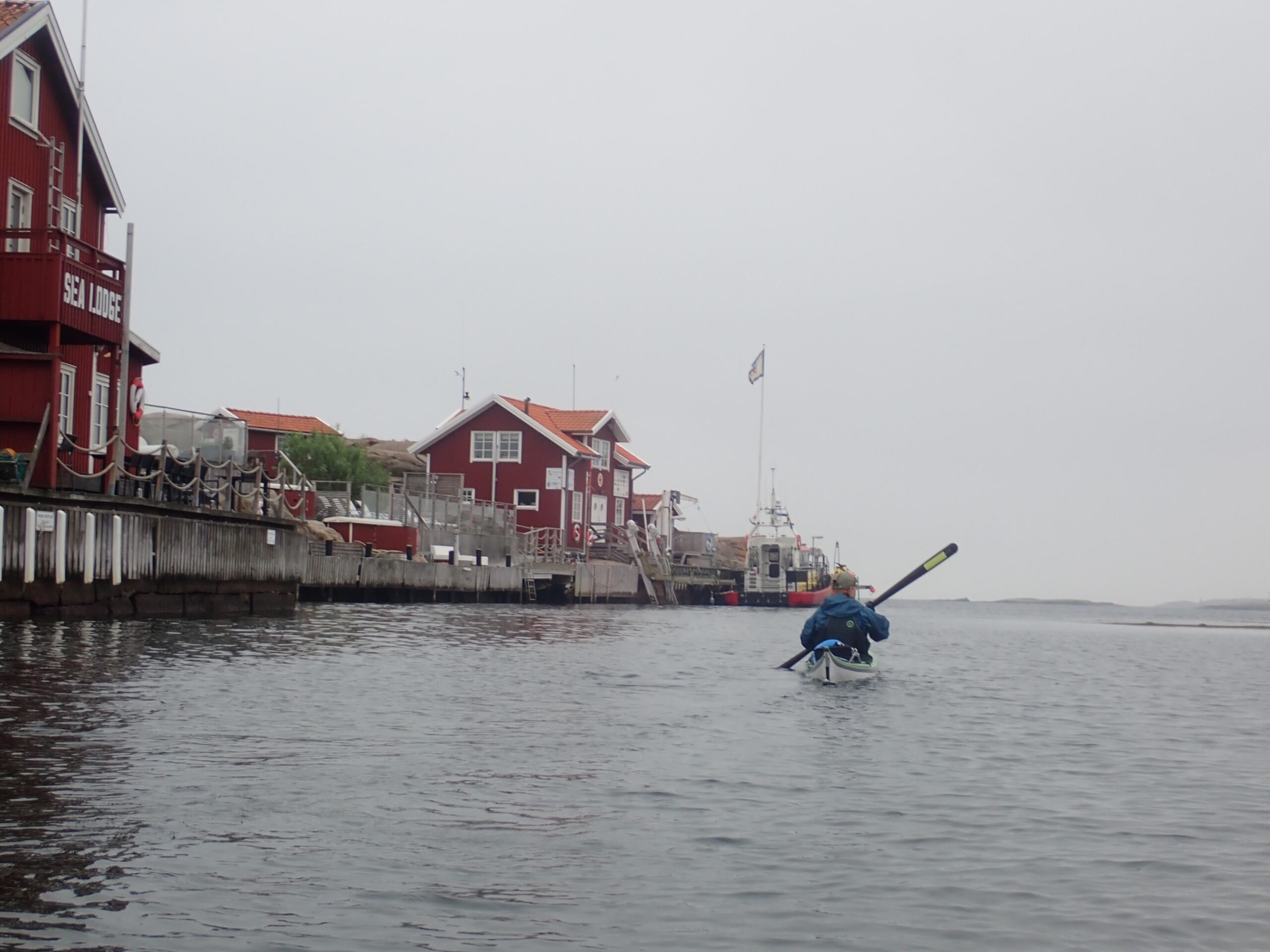 Vi havde bestemt os for at flotte os i dag med en sen frokost. Noget med fiskefilet og pommes, så vi padlede mod Smögen som jo bestemt måtte have en slags…. Det havde de også. Et sted eller måske 2 steder, men resten var ikke åbnet for sæsonen og herudover var det umuligt at finde et sted at trække kajakkerne op. Det er helt klar mit et sted for lystsejlere og helt klart også et meget turistpræget sted. Vi behøvede i hvert fald ikke komme tilbage… men altså. Vi måtte opgive og satte i stedet afsted mod den ø vi havde valgt at overnatte på, Rammen. Godt 4 kom fra Smögen. Vi roede forbi sydsiden af Kungshamn som til gengæld var virkelig charmerede.