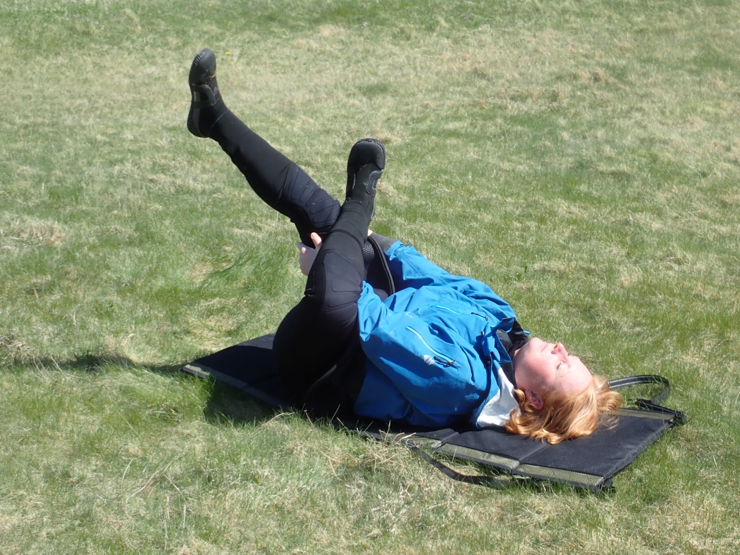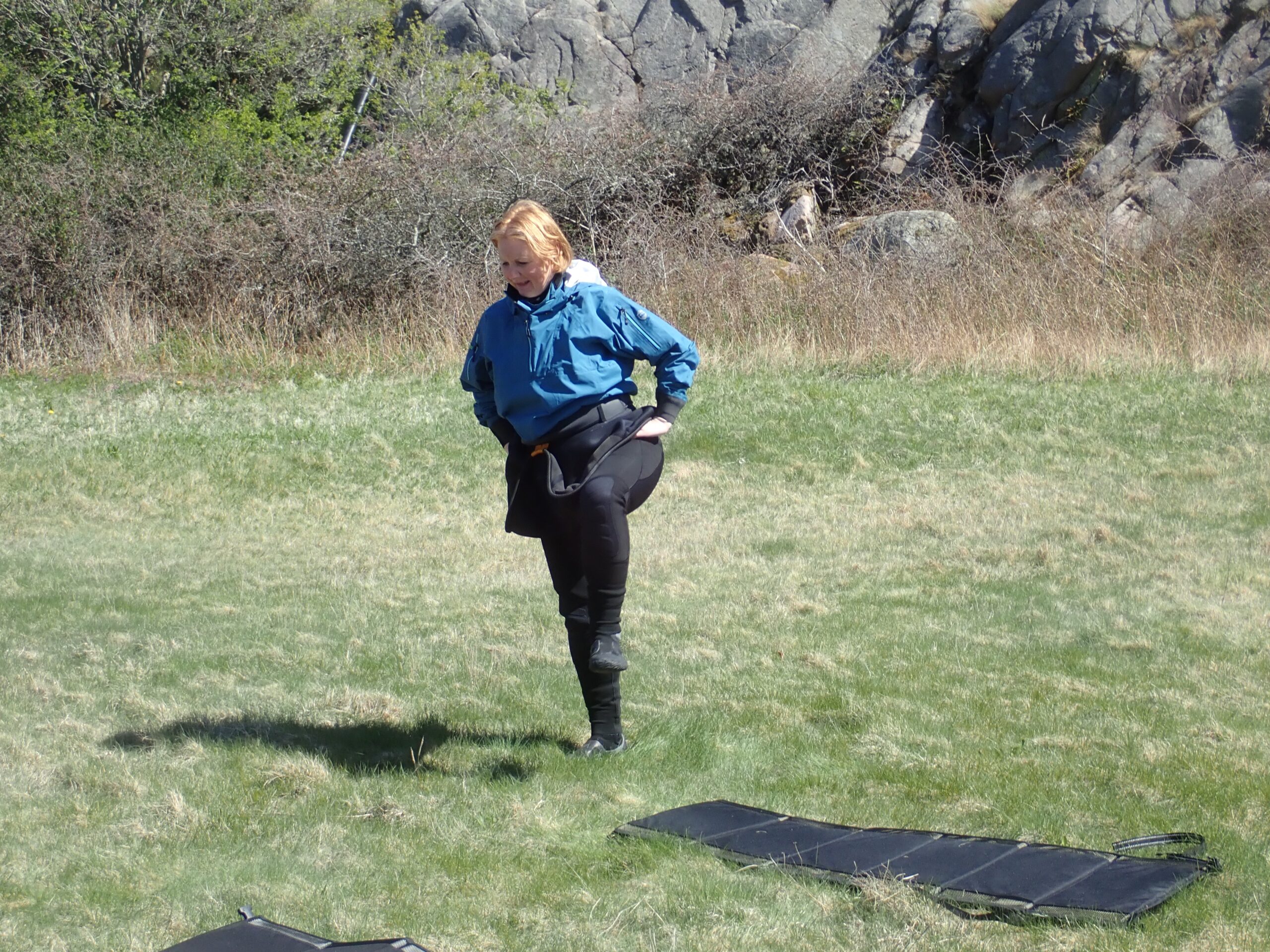 Efter frokost i solen, lavede vi vores morgen gymnastik. Bedre sent end aldrig. Det ser lidt tåbeligt ud, men det er vældig godt, når man skal sidde længe i en kajak. Hofteåbner og diverse ben- og rygstræk 🙂