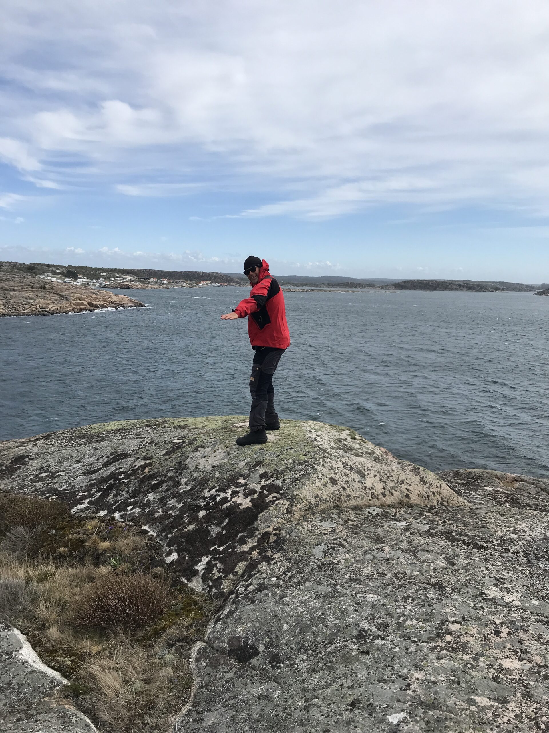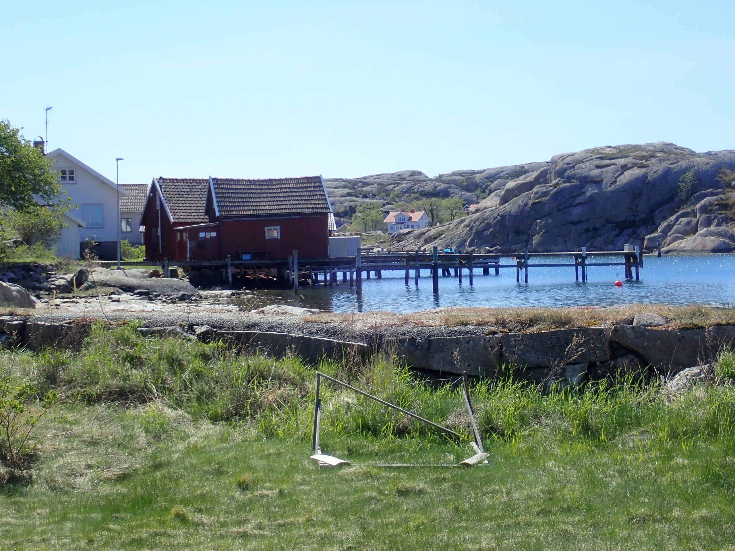 På grund af vejret nåede vi aldrig til Käringön. Der var simpelhen for meget vind og vi ville prioritere at komme i læ i Stigfjorden, når vinden ville tage til igen. Så onsdag padlede vi ud fra Vallerö og ud over det åbne stykke på ca 2 km mod skærene ved fastlandet. Vinden var i sydvest så vi fik den ind fra siden på vej. Der var pænt store bølger, der havde taget til over de sidste par dage ude fra Skagerak. Da vi kom over skulle vi lige holde fri af et skær og så drejede vi skarpt og gik gennem skærene syd for Saltö. Det var lidt lavere her og bølgerne var godt nok store. Ca en 1,2 m. Det var ikke nødvendigt at padle så meget ind, men bagroret blev flittigt brugt. Vi ladede dog uden de store problemer, men med lidt kriller i maven, bag skærene og kunne padle det næste stykke i læ. Der var endnu et stykke med vind og lidt bølger på vej ind mod Mollösund. Vi fandt en ophalingsplads lige før lystbådehavnen, lige ved Morgans Fisk og Skaldyr. En ældre mand rejste sig fra sin havestol og kom os i møde. Det var Morgan. Han ville gerne høre lidt om hvor vi kom fra og spurgte om vi manglede vand. Det kunne vi få af ham. Så gik vi ind til butikken i den lille by. Et virkelig hyggeligt lille samfund. Skøn afslappet stemning og knap så turist præget som nogle af de andre steder vi har været forbi. Der var selvfølgelig de store lystbåde i havnen mange af husene var tydeligvis solgt til sommerhuse. Men der var stadig en god stemning. Tilbage på havnen fik vi en mad inden vi satte ud igen. Det passede faktisk lige med at vejret slog om fra høj sol til regn og blæst. Det gav lidt en hård tur fra Mollösund og ind i Stigfjorden. Vi fik lidt læ langs øen Lyr, da bygen var drevet forbi. Vi havde udkik på nogle forskellige lejerpladser på 3 øer i Stigfjorden. Vi ville gerne fine et plant og godt sted, da vi skulle lægge over endnu en dag grundet vind. Morgan advarede os om at der kunne blive op til 20 sek/m torsdag. Vi havde selv regnet med en middelvind på 14 sek/m og det var netop derfor at vi søgte ind i fjorden. Den første plads på Stävö var ikke noget ved og heller ikke de næste på Hjälm men så fandt vi da heldigvis en god Vig på Hälsön, hvor der både var læ og fin græsplæne. Vi ankom ved 20 tiden efter at have tilbagelagt 26 km.