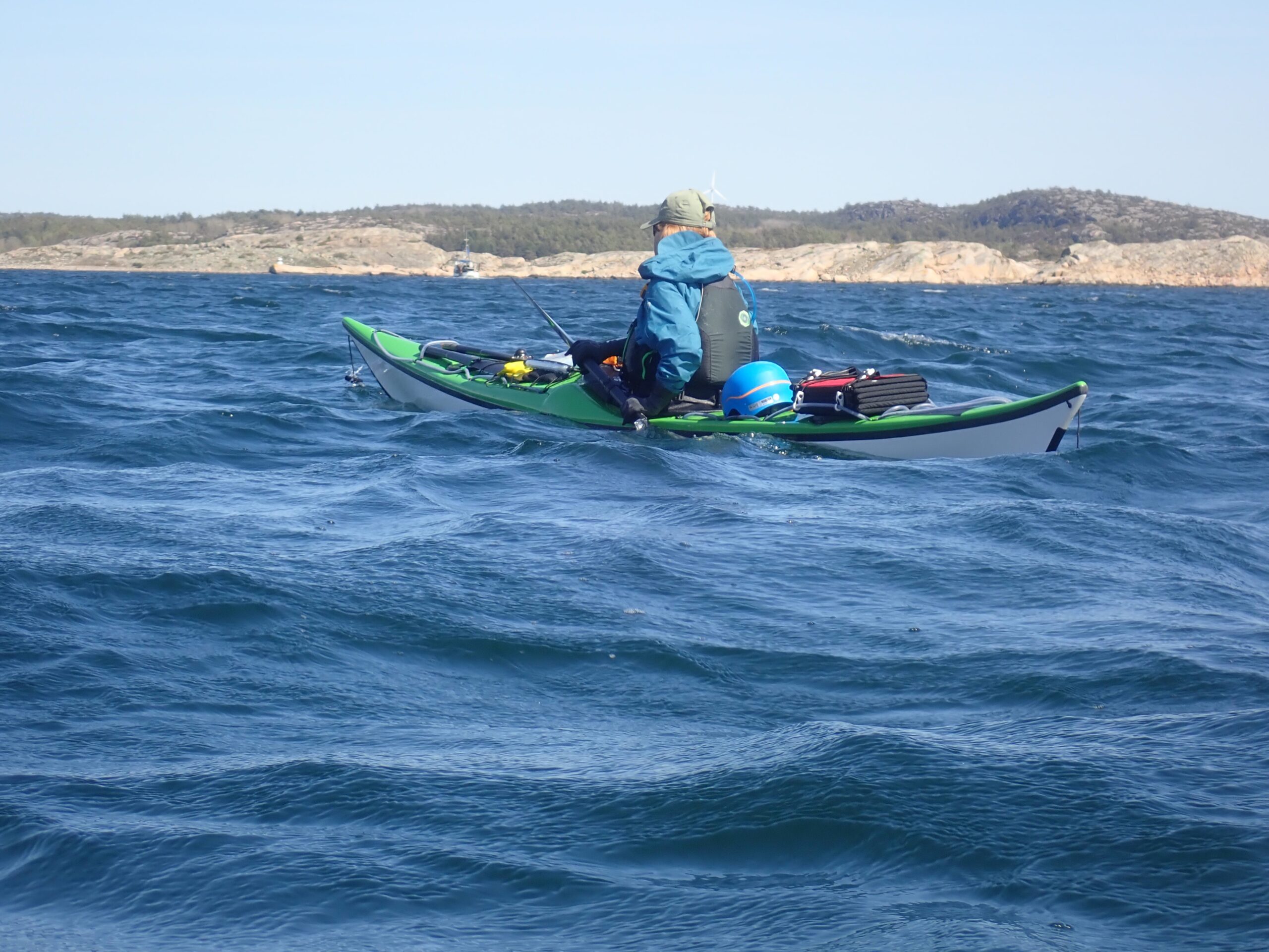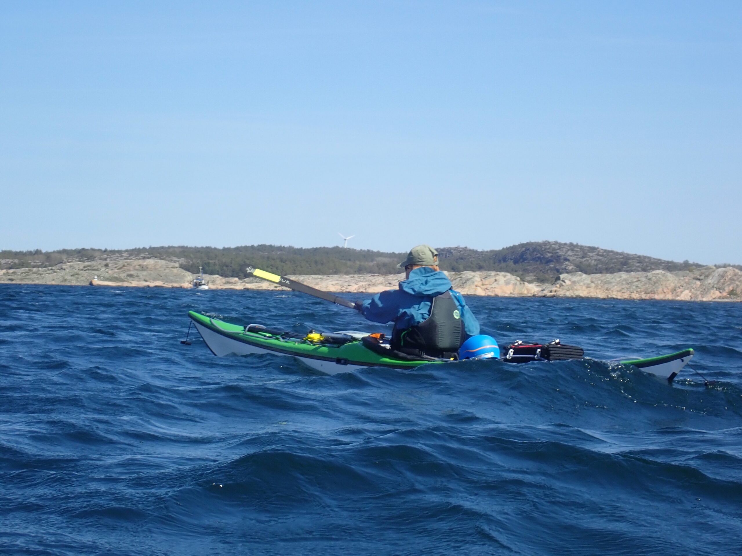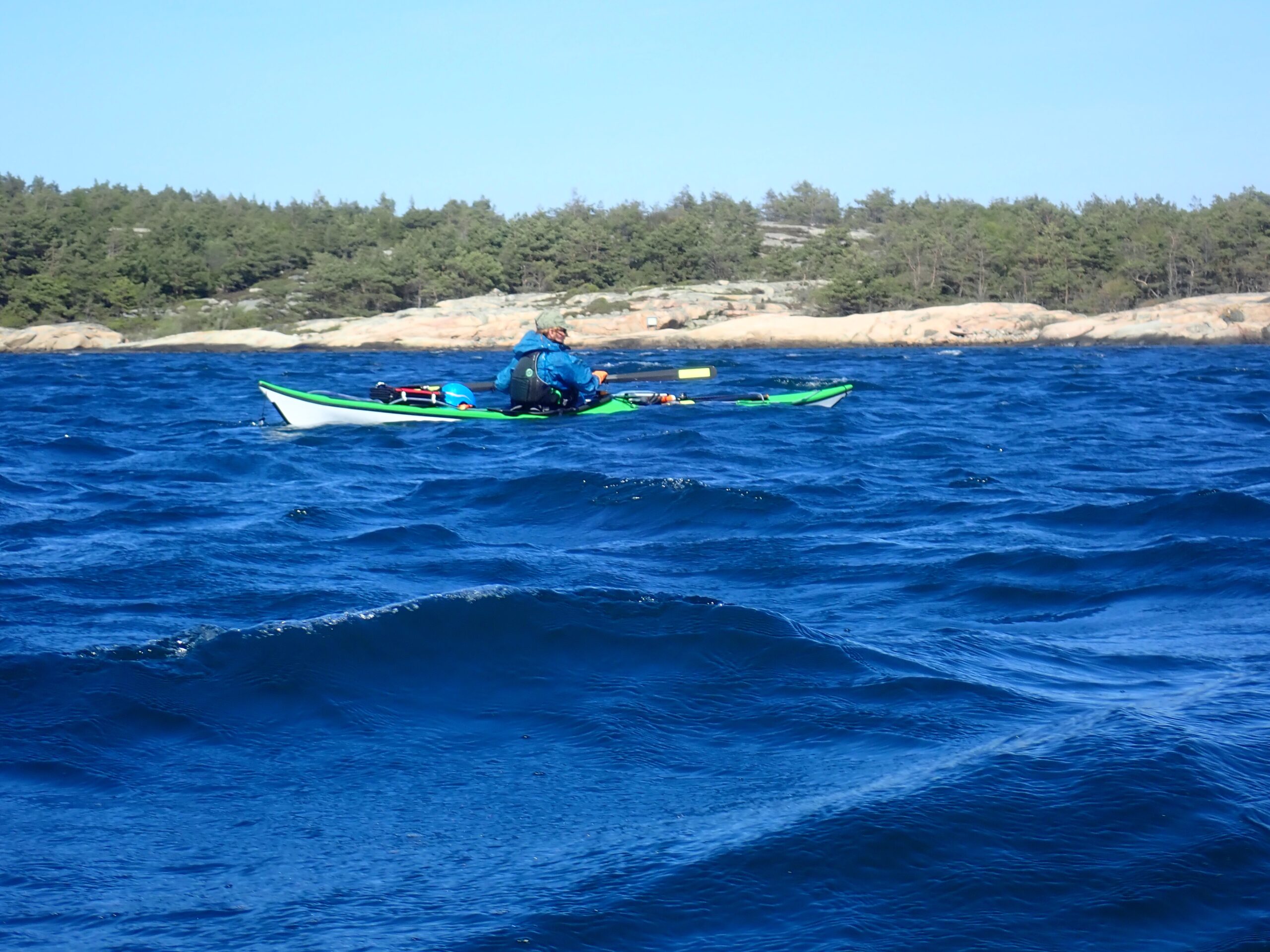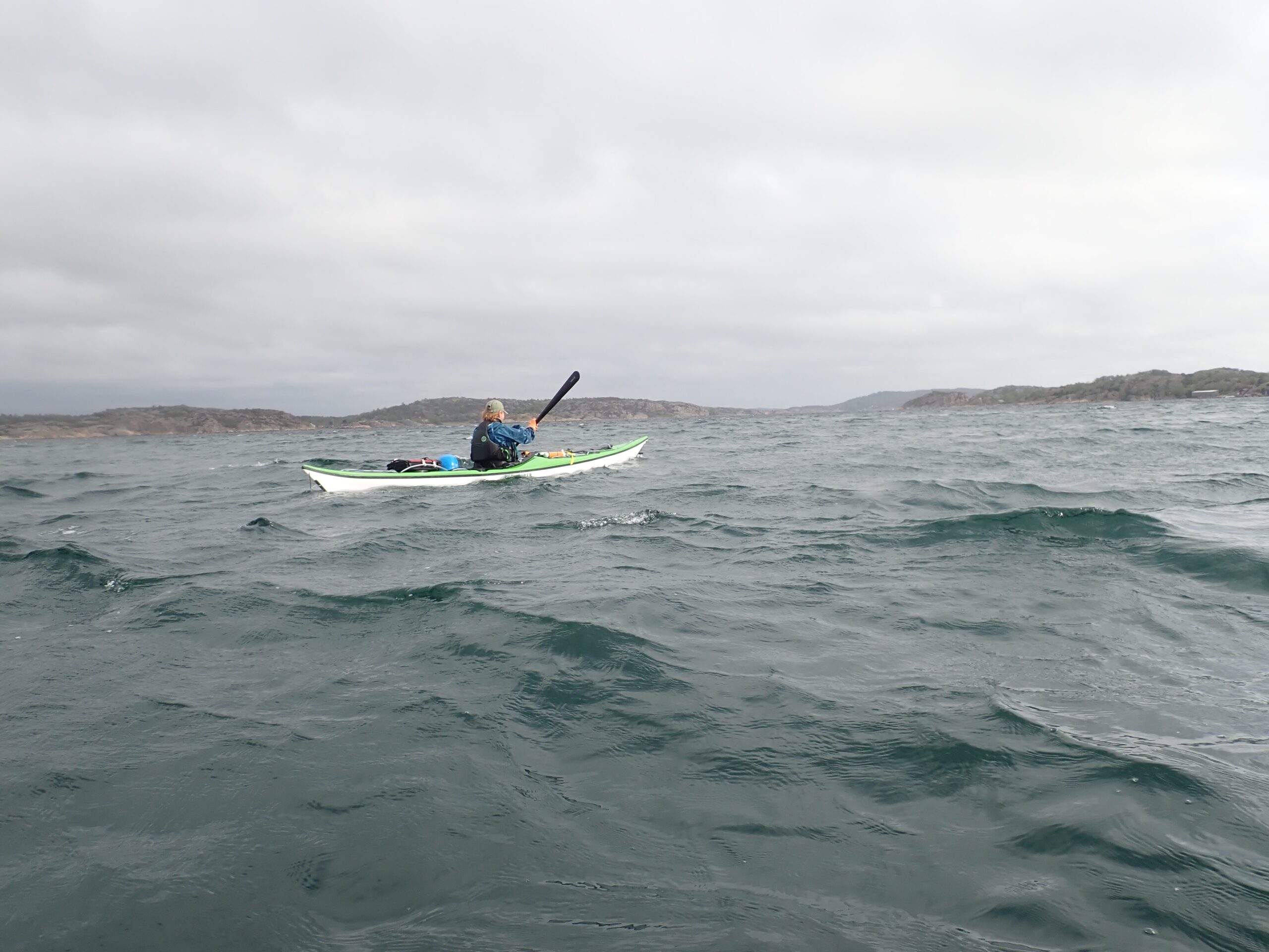 Det blev til i alt 17,1 km med op til en 14/15 m/sek. i vindstød. Af og til var det næsten ikke var til at flytte kajakken. Ikke så høje bølger dog, da vi lå skærmet i skærgården.