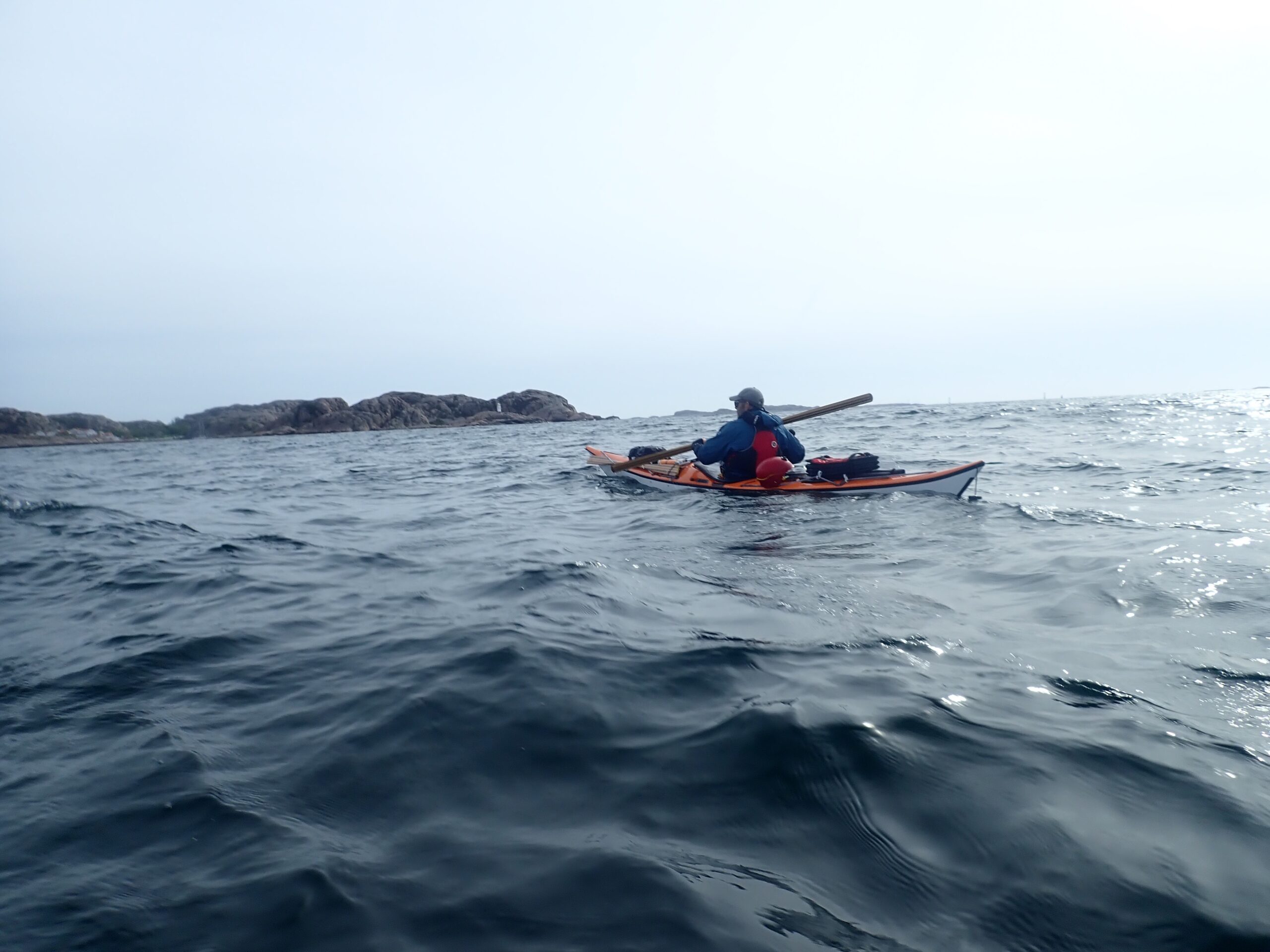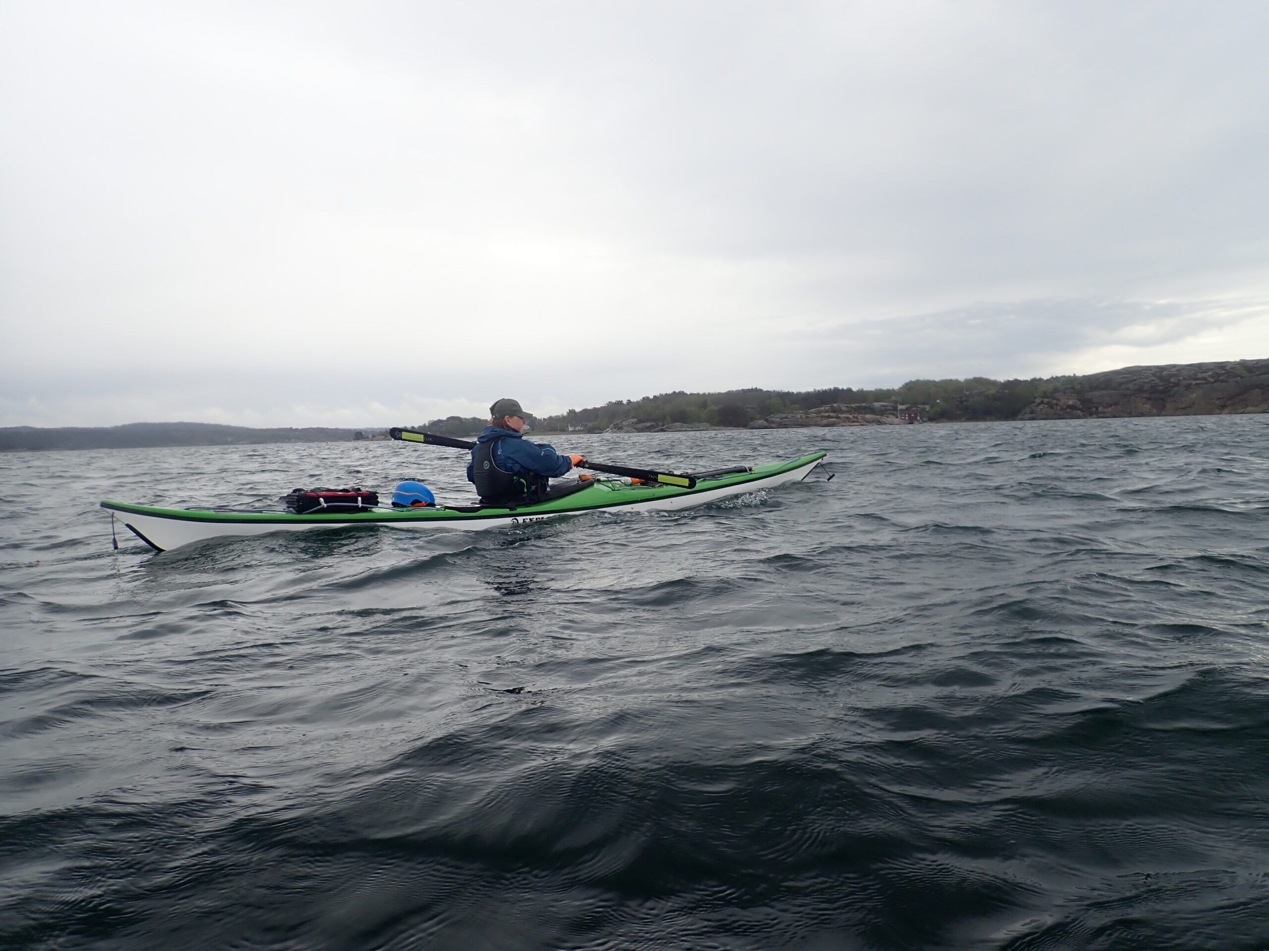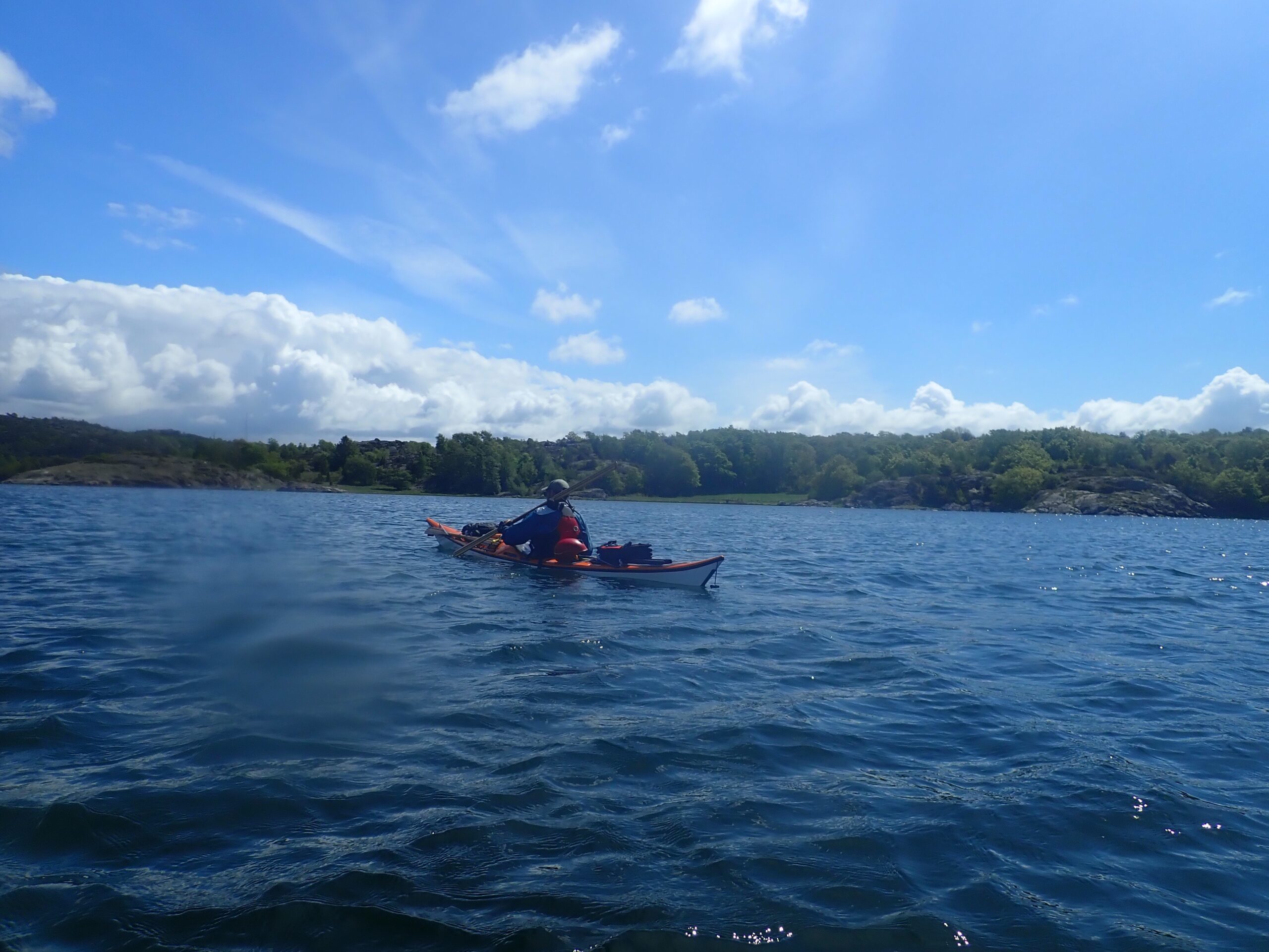 Det blev til i alt 17,1 km med op til en 14/15 m/sek. i vindstød. Af og til var det næsten ikke var til at flytte kajakken. Ikke så høje bølger dog, da vi lå skærmet i skærgården.