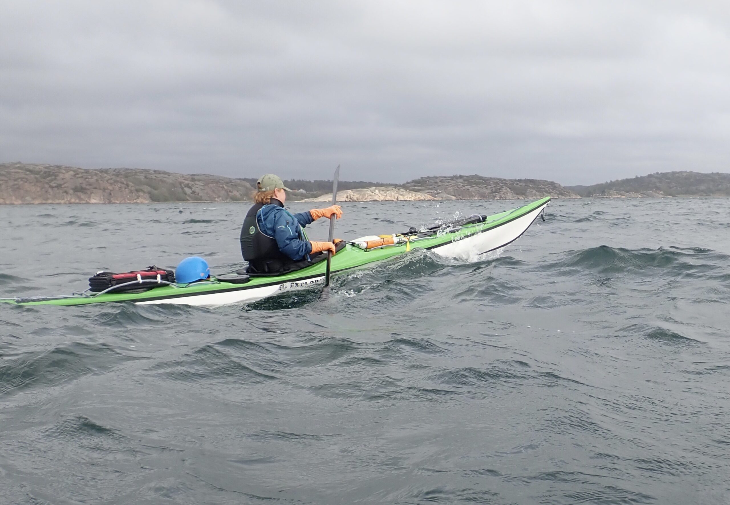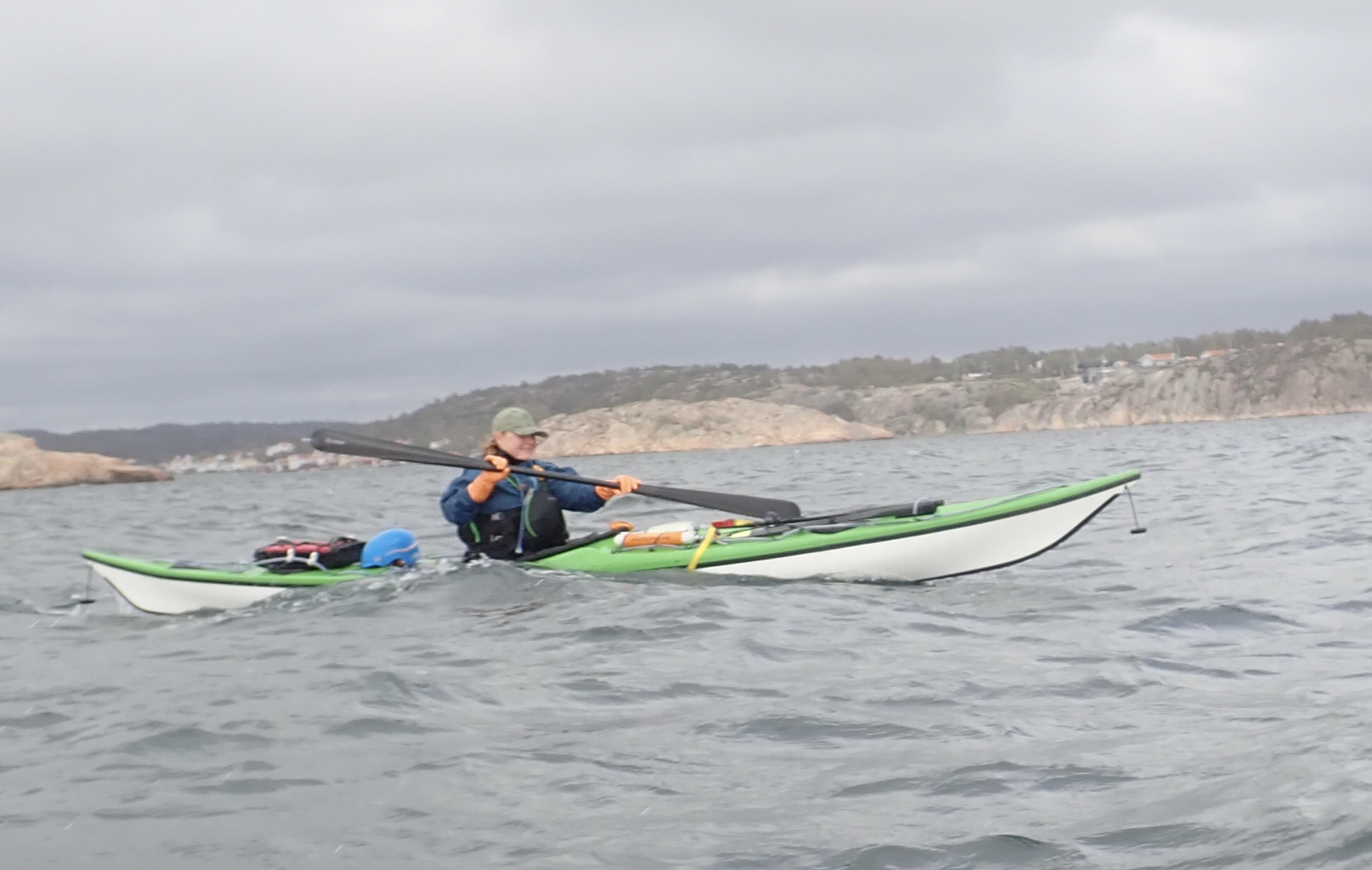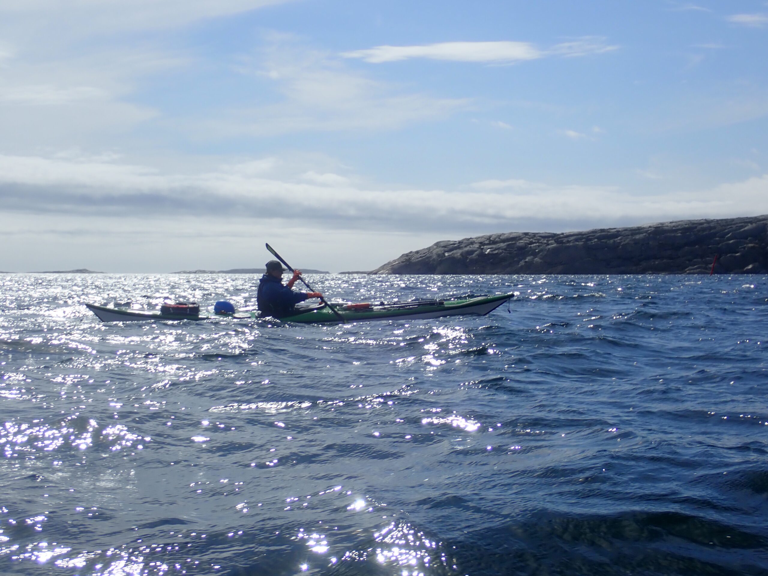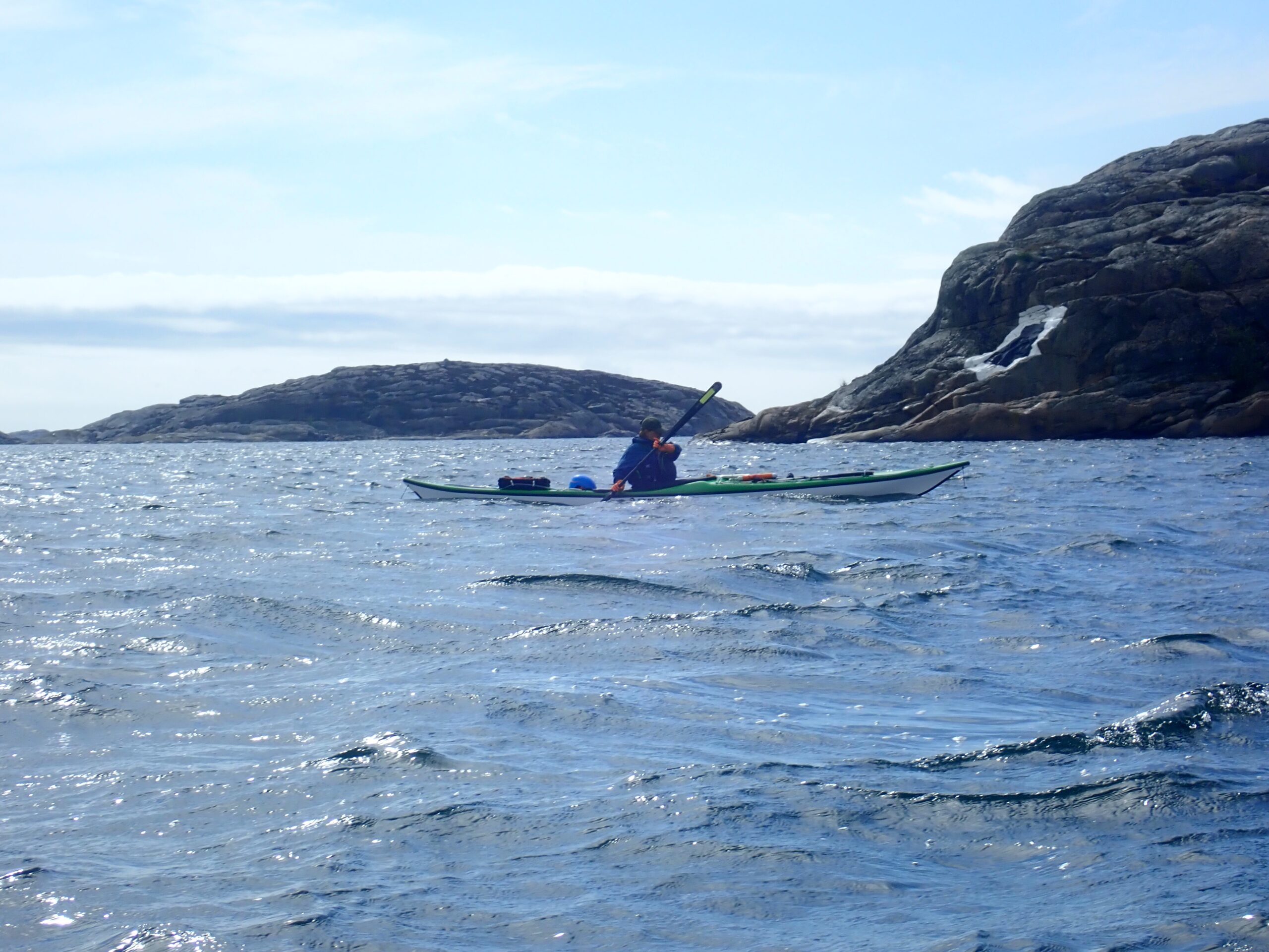 Det blev til i alt 17,1 km med op til en 14/15 m/sek. i vindstød. Af og til var det næsten ikke var til at flytte kajakken. Ikke så høje bølger dog, da vi lå skærmet i skærgården.