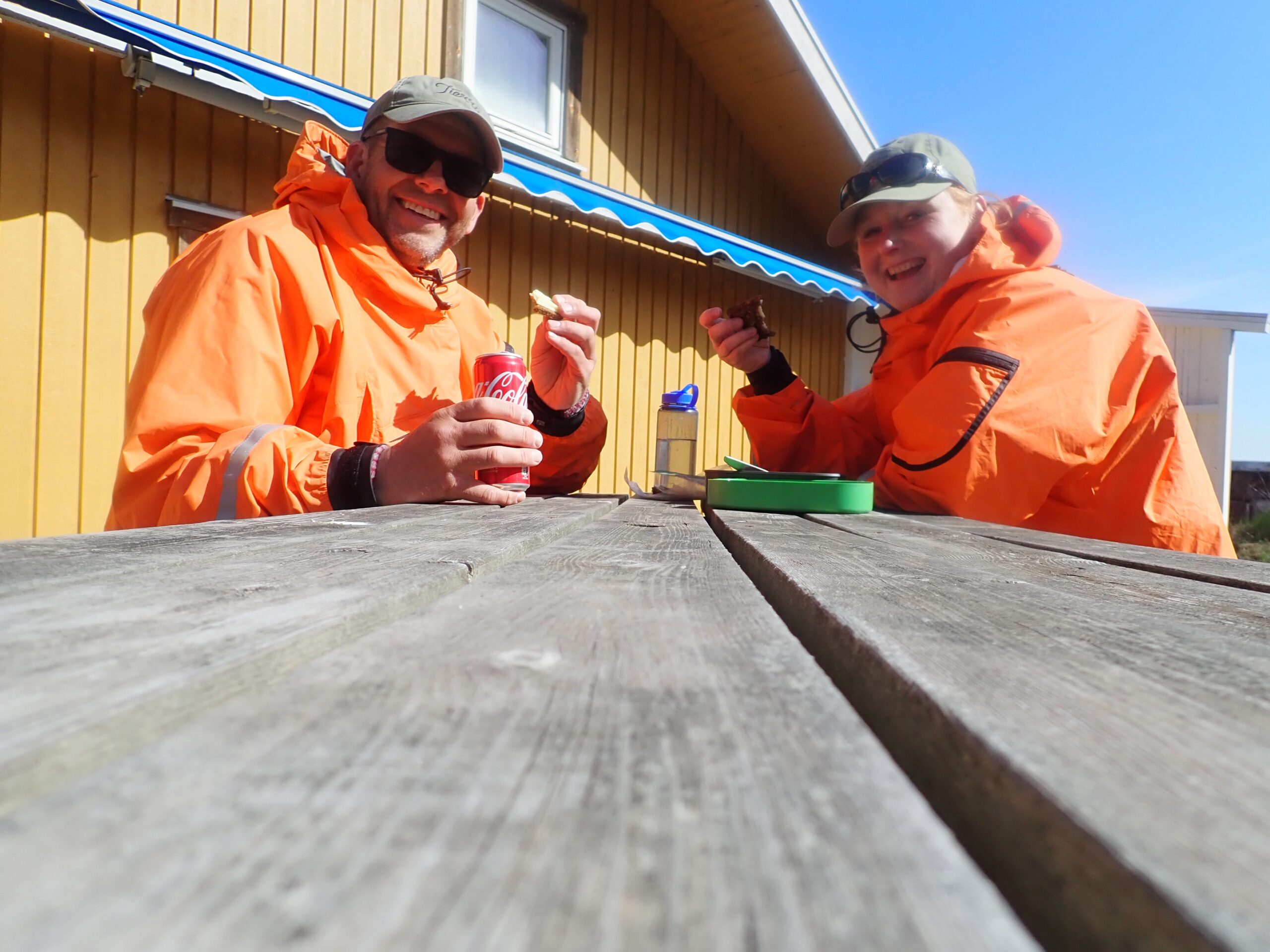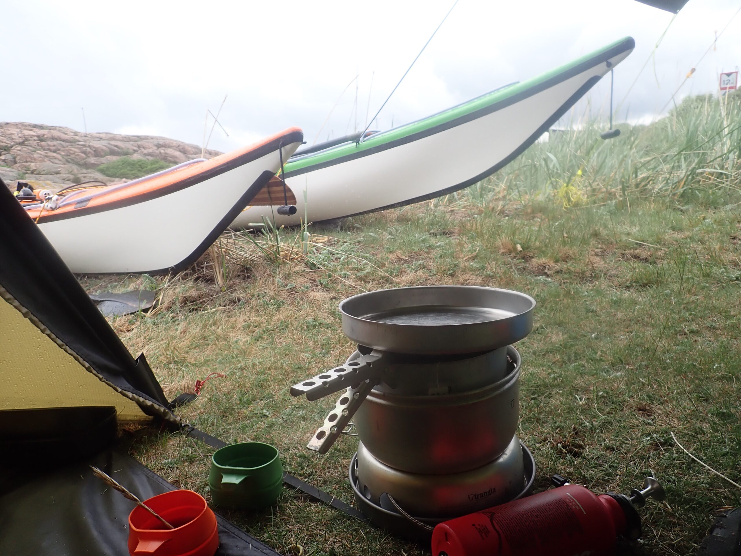 Vi fandt øen og vigen og lejrpladsen og fik slået teltet op og sat en tarp. Vi har efterhånden fundet en arbejdsfordeling der hedder at vi hjælpes lidt med teltet. Først skal der spilles “gåse-golf”, som betyder at der skal fjernes gåselort fra det udvalgte teltområde. Det skal forresten nøje udvælges, da det skal være helt plant og ligge godt for både udsigt og vind om muligt. Kristine klæder om først og Lars fæstner kajakker og sætter evt. tarp imens Kristine puster liggeunderlag op, arrangerer stolekit og får indrettet med soveposer, hovedpuder og de ting vi bruger i teltet så som toilettaske, spade, toiletpapir, skraldepose og spisegrej. Lars sætter maden til opblødning og så er vi klar samtidig til telthygge. Den består gerne af lidt nødder eller oliven, måske et stykke chokolade, hvis det har været en lang dag og ellers lidt mobil, vejrudsigt og ebog. Det er dejligt at sidde i teltet og slappe af, med fødderne i soveposen.