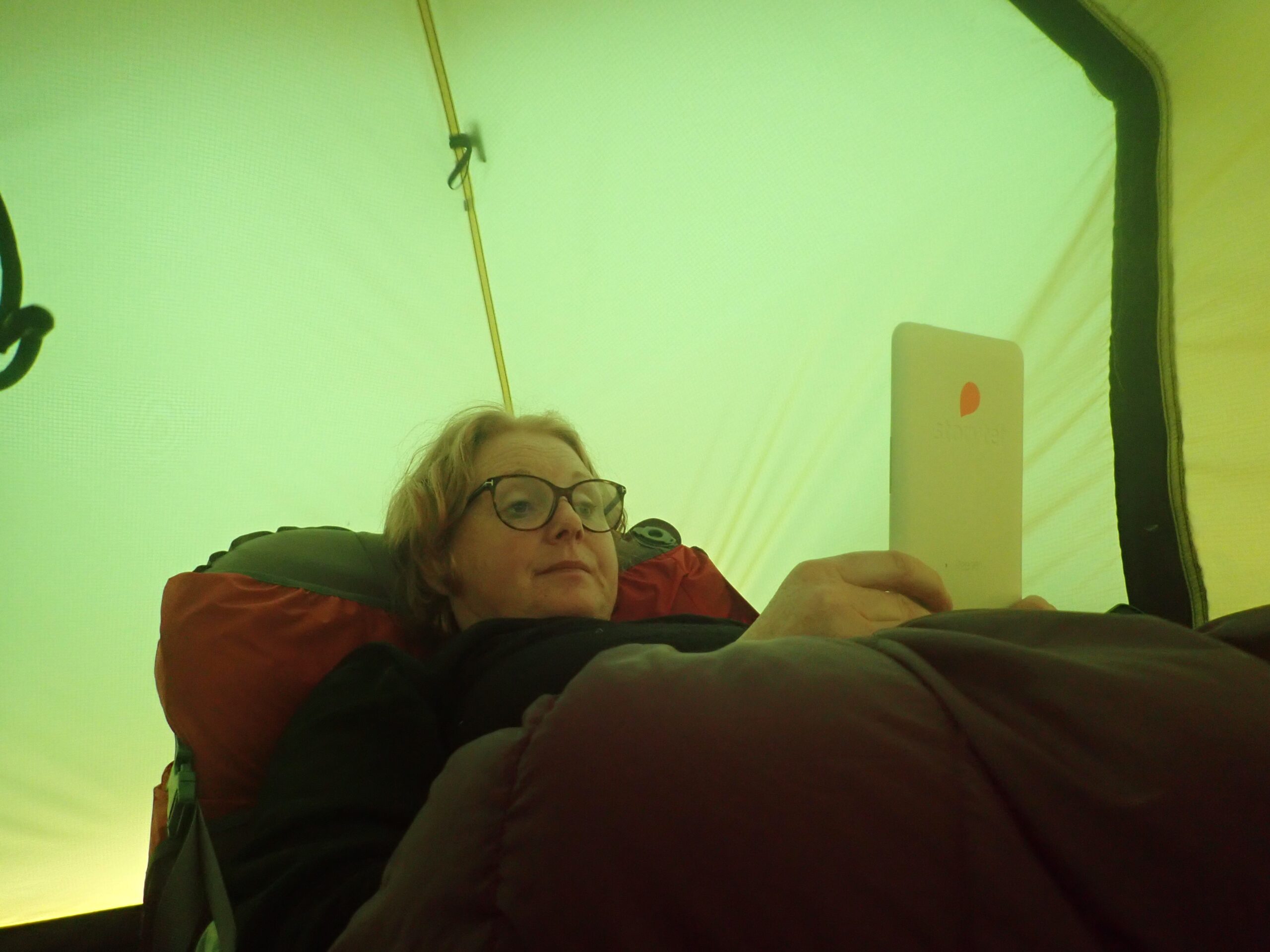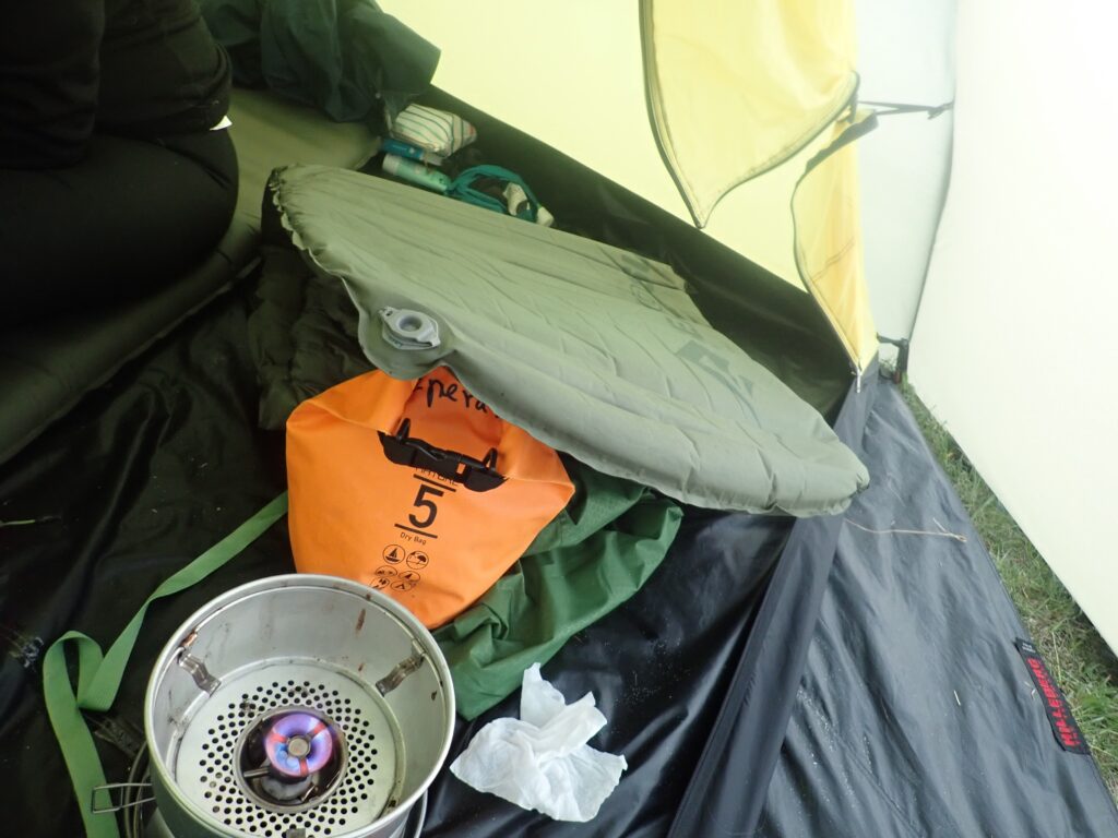 Resten af dagen bød på telthygge og ebøger, selvom der også indtraf en mindre katastrofe 😱 Lars’ underlag punkterede. Det er efterhånden blevet en dårlig tradition. Godt at vi havde lim med i reparationsudstyret. Det blev limet og varmet og tørret, men det ville ikke hærde inden vi skulle sove. Så fik Lars en mulighed for at prøve at sov på vores 4-i-1 paddlefloats. Det gik faktisk overraskende godt. Næste dag var limen hærdet, underlaget var tæt igen og katastrofen afblæst.