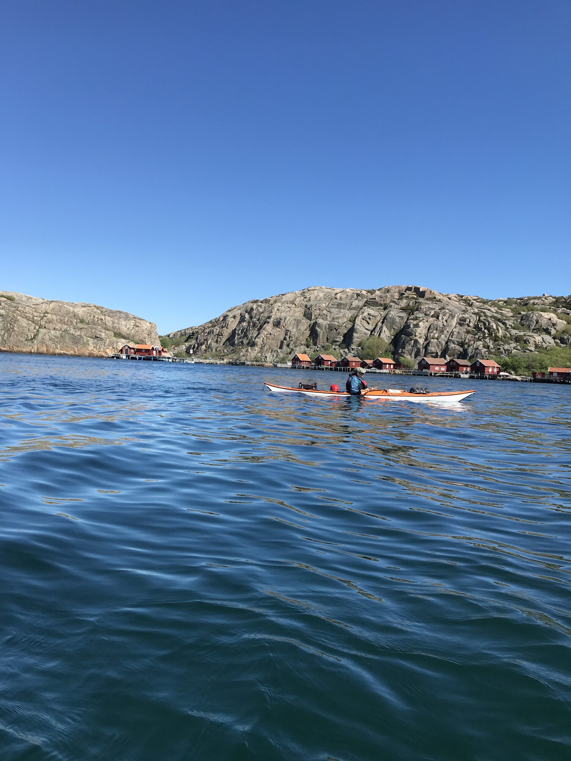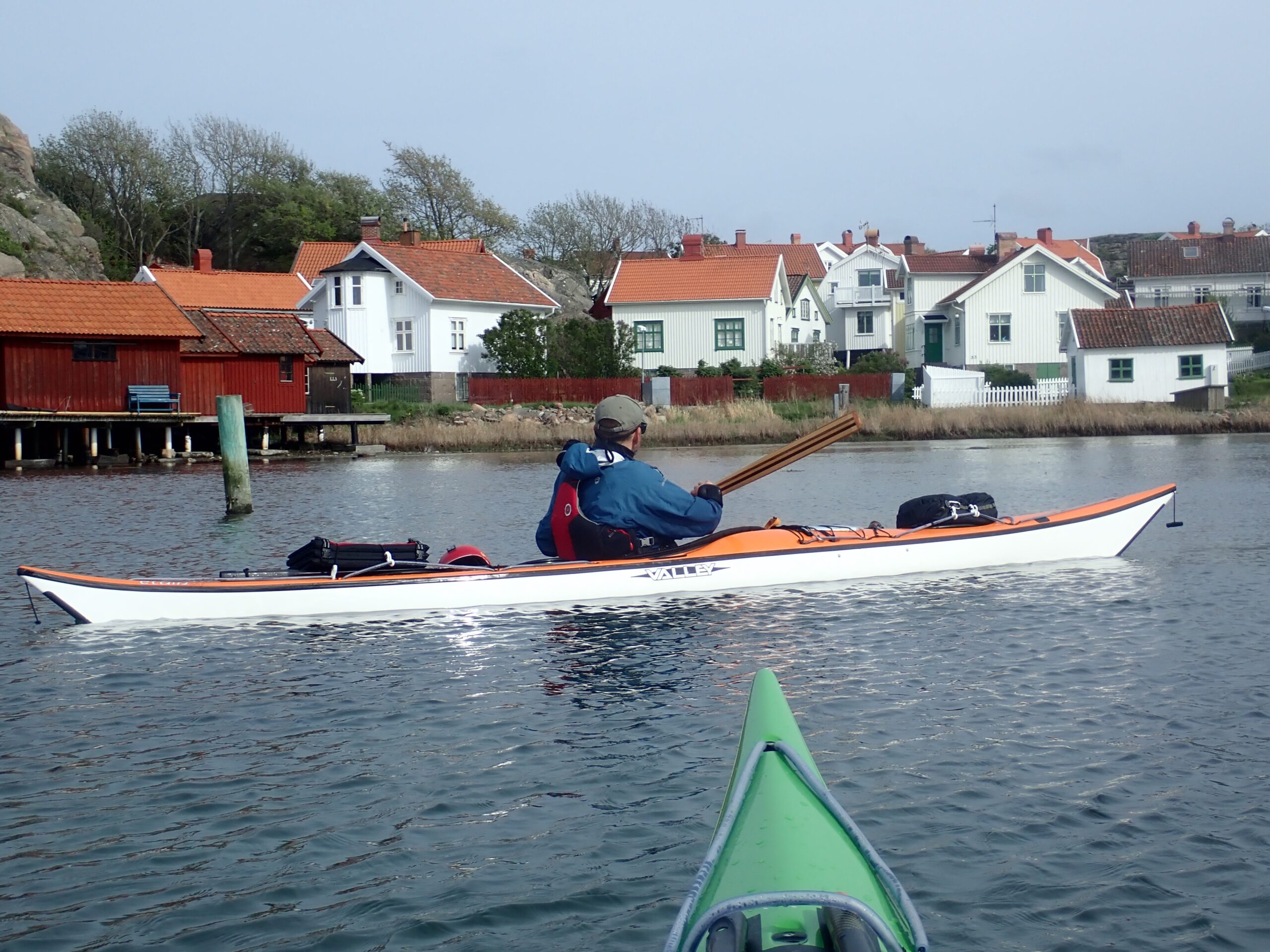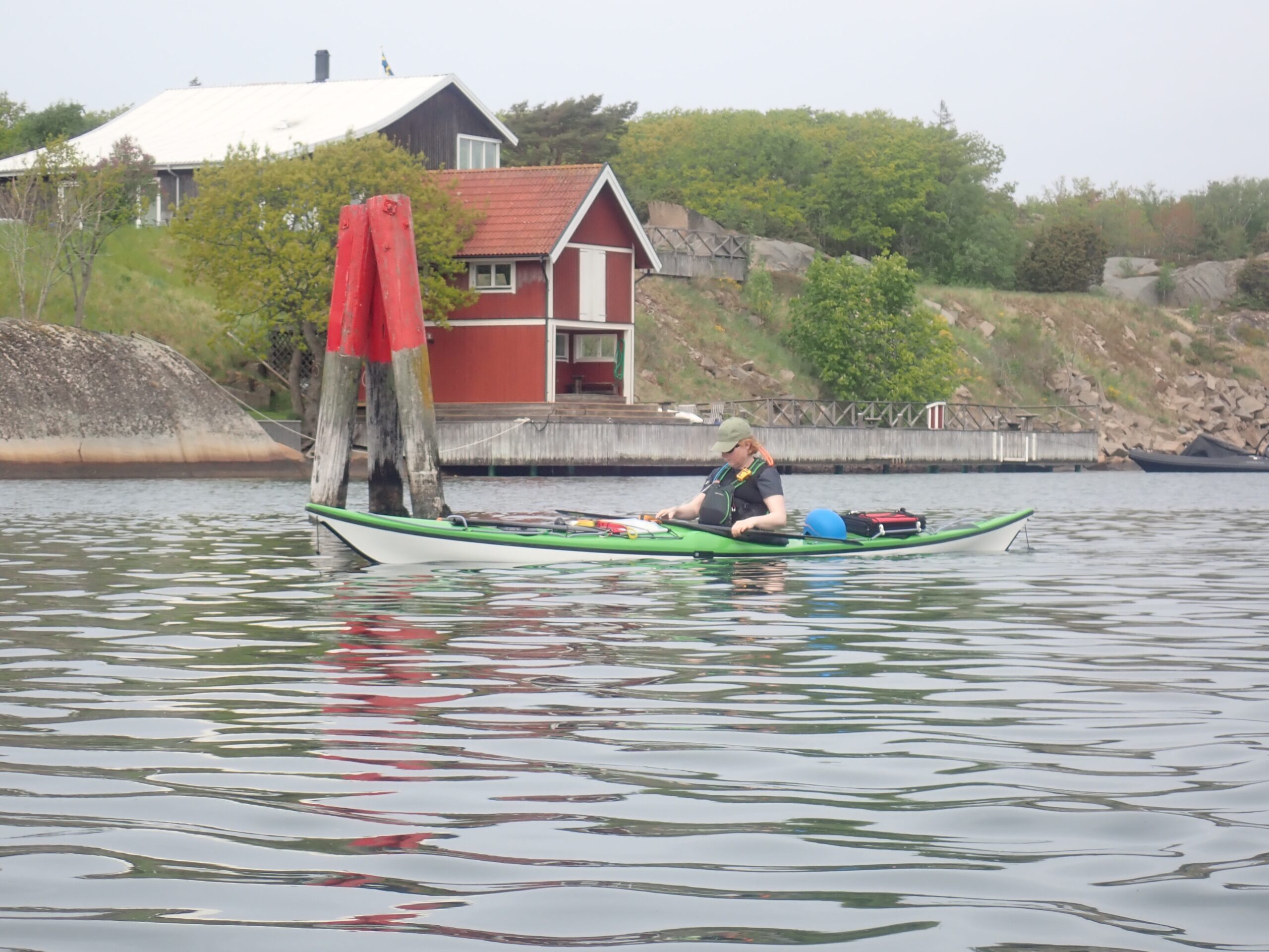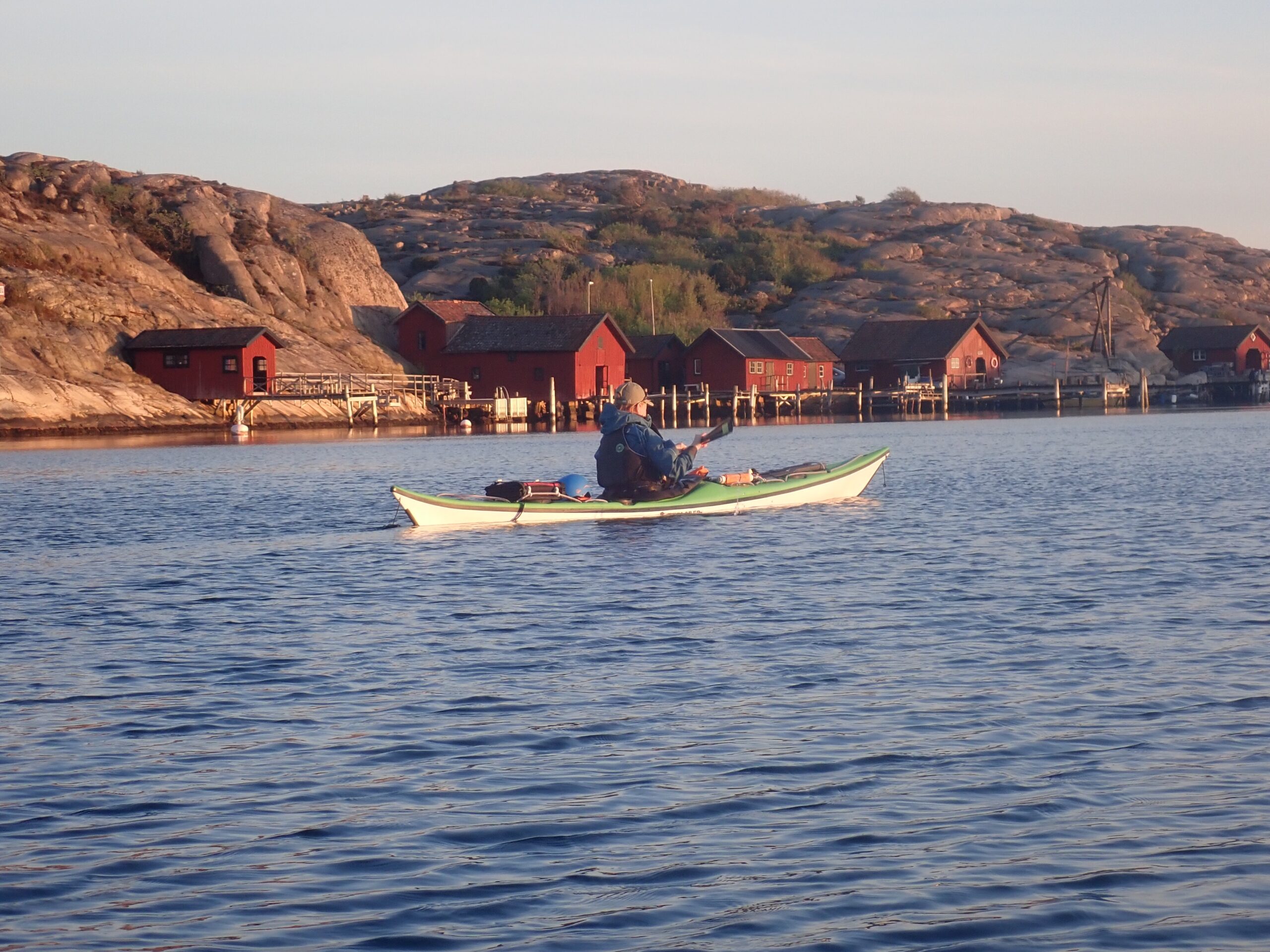 Lørdag blev en slapper dag. Det regnede og blæste lidt og det gad vi ikke ro i. Så vi læste. Sidst på dagen tittede solen dog frem, så vi hoppede i kajakkerne og Kristine øvede lidt teknik i vigen foran havnen. Derefter gik vi en tur op mellem de fine gamle huse og så de velplejede haver. Sikke et kulturhistorisk miljø. Det meste af bebyggelserne har sin begyndelse i slutningen af 1700 tallet, som også betegnes som den store silde-periode. Da sildene forsvand hen på 1800 tallet forsvandt folk ind til fastlandet men de kom igen, da sildene kom igen. Da der var flest folk på øerne boede her omkring 300 personer. Nu er sildene væk igen og dermed også de fastboende.