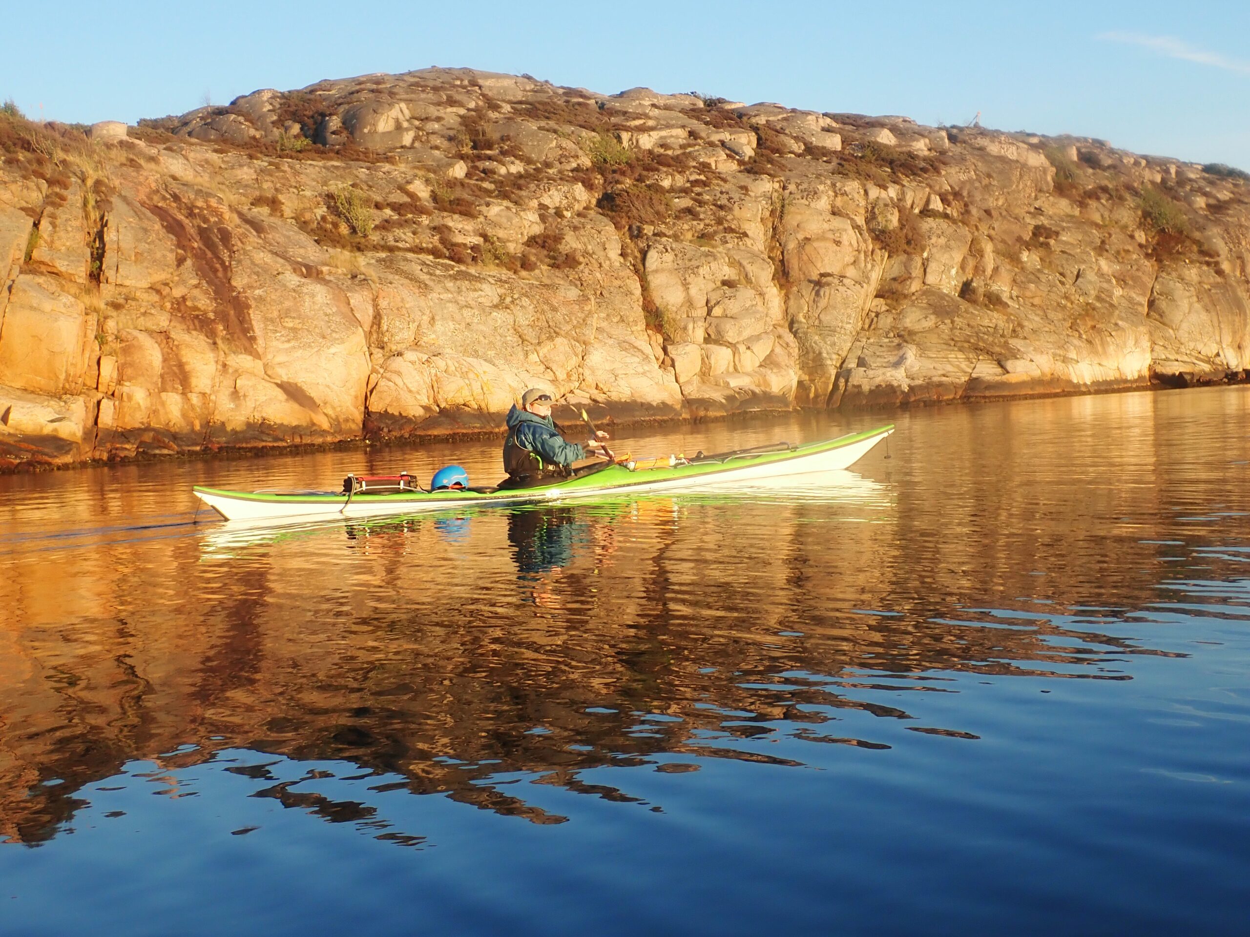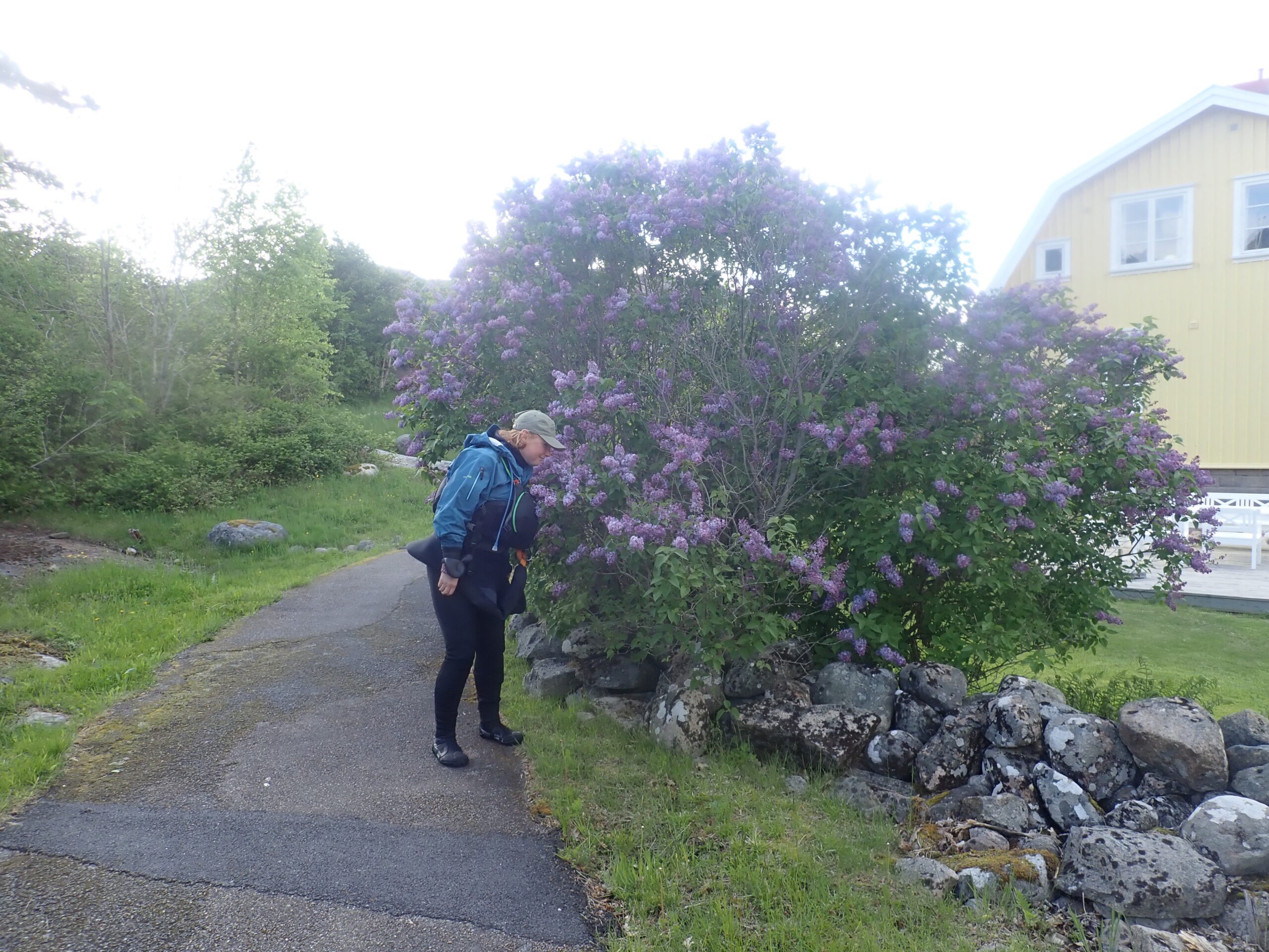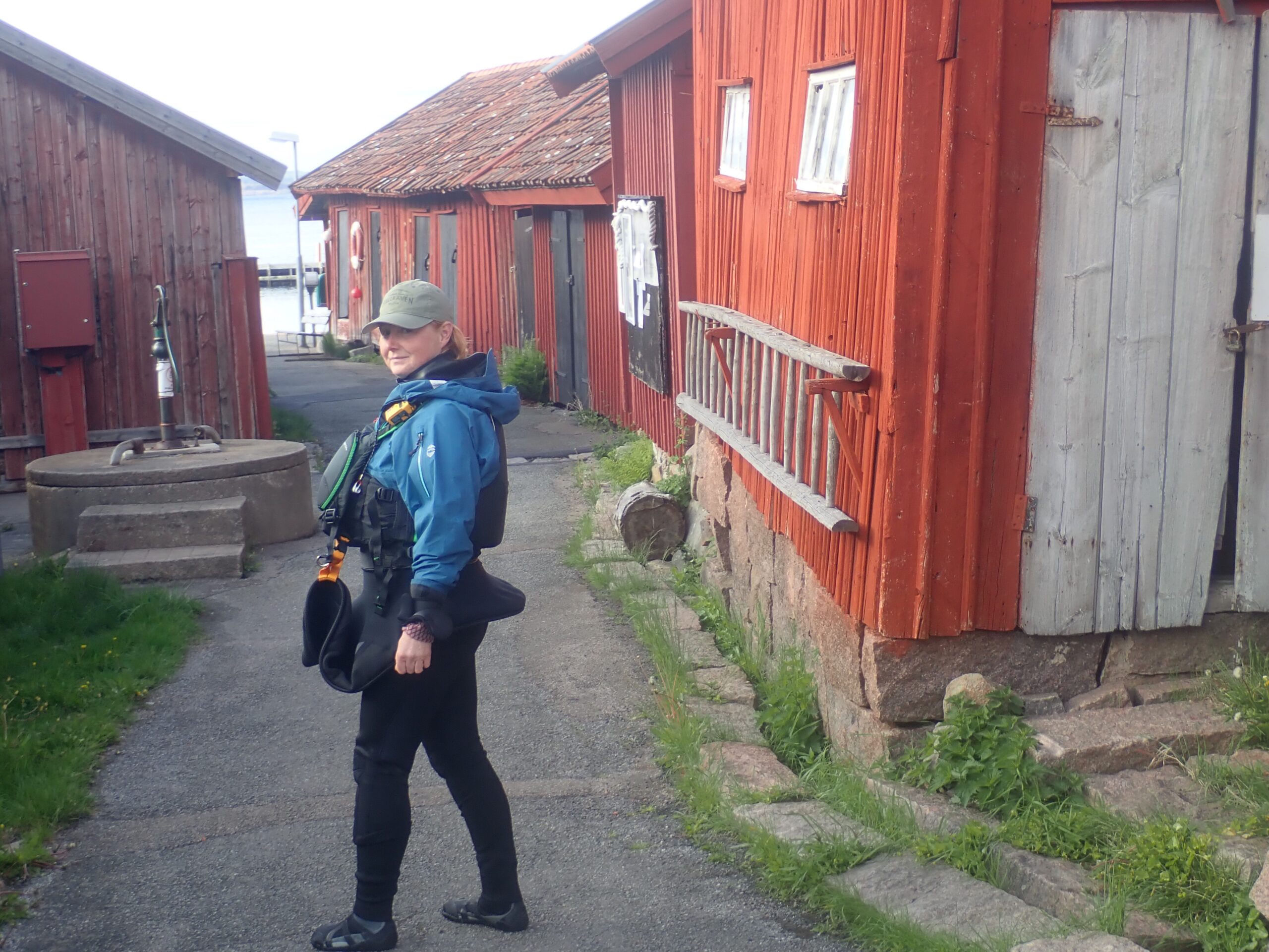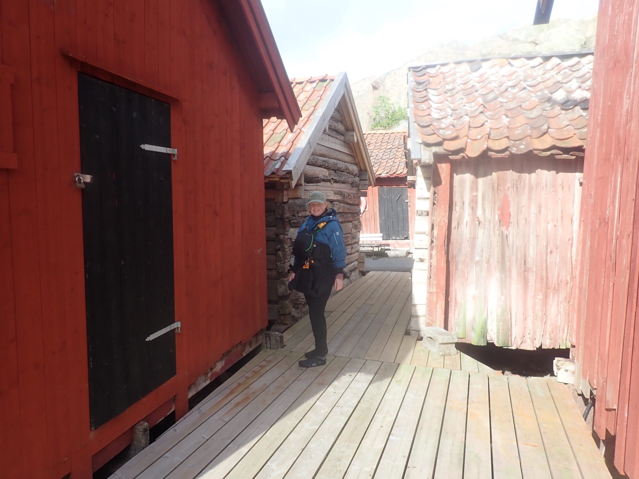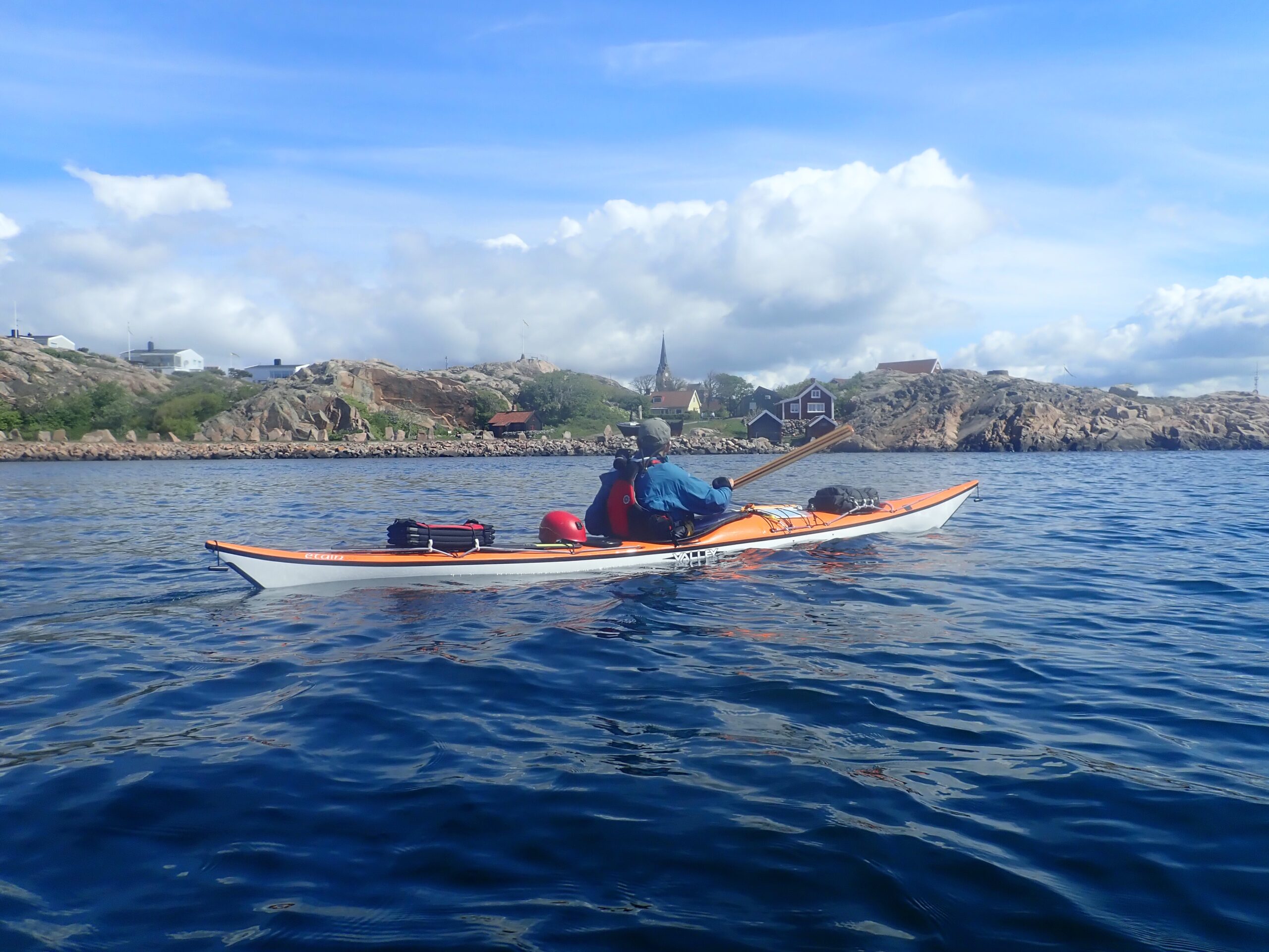 Lørdag blev en slapper dag. Det regnede og blæste lidt og det gad vi ikke ro i. Så vi læste. Sidst på dagen tittede solen dog frem, så vi hoppede i kajakkerne og Kristine øvede lidt teknik i vigen foran havnen. Derefter gik vi en tur op mellem de fine gamle huse og så de velplejede haver. Sikke et kulturhistorisk miljø. Det meste af bebyggelserne har sin begyndelse i slutningen af 1700 tallet, som også betegnes som den store silde-periode. Da sildene forsvand hen på 1800 tallet forsvandt folk ind til fastlandet men de kom igen, da sildene kom igen. Da der var flest folk på øerne boede her omkring 300 personer. Nu er sildene væk igen og dermed også de fastboende.