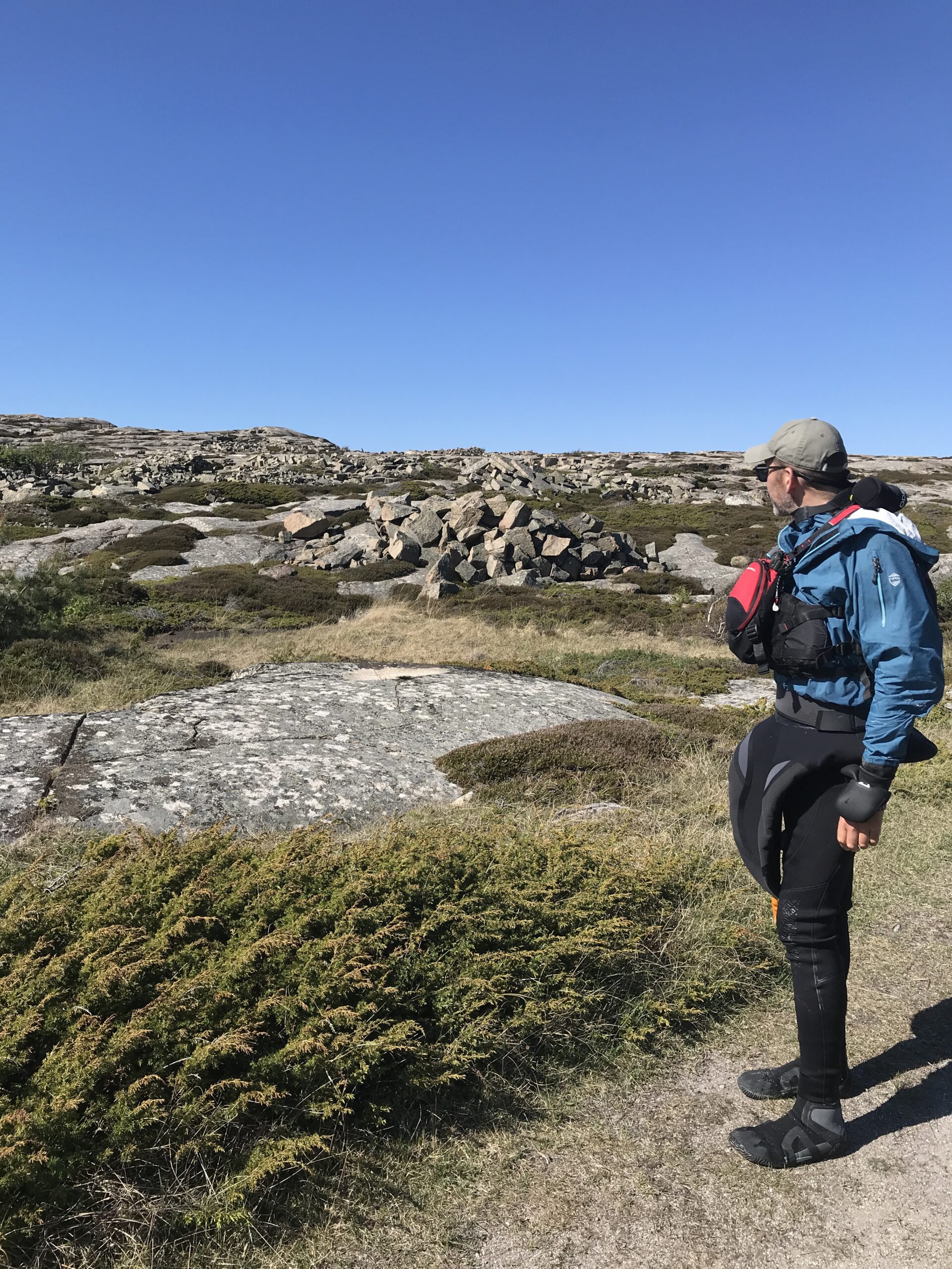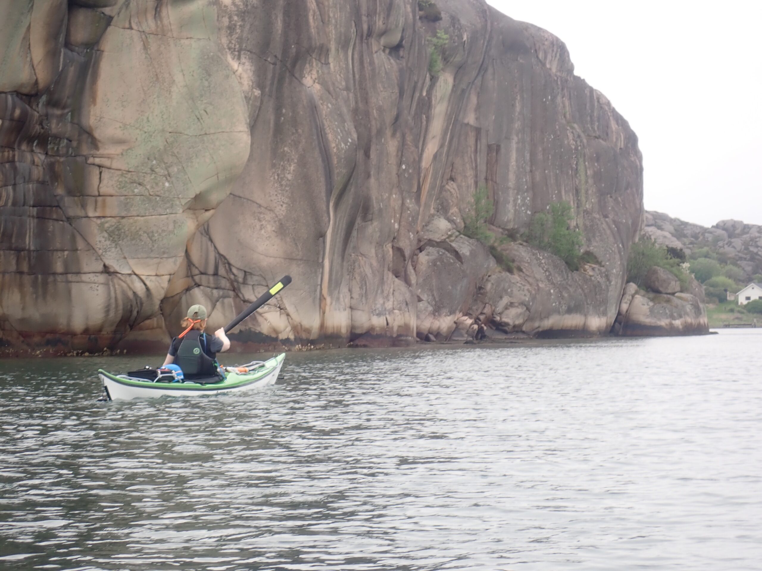 Onsdag nogen var der en del vind men igen regn så vi fik tørret vores padletøj på den interimistisk grønlandske åre-løsning og fastgjort teltet med yderligere barduner. Der blev også tid til en vandre/klatretur rundt på øen, der ligesom mange af de andre skær og øer i området bære præg af stenhuggervirksomhed, som var igang op til 1930erne.