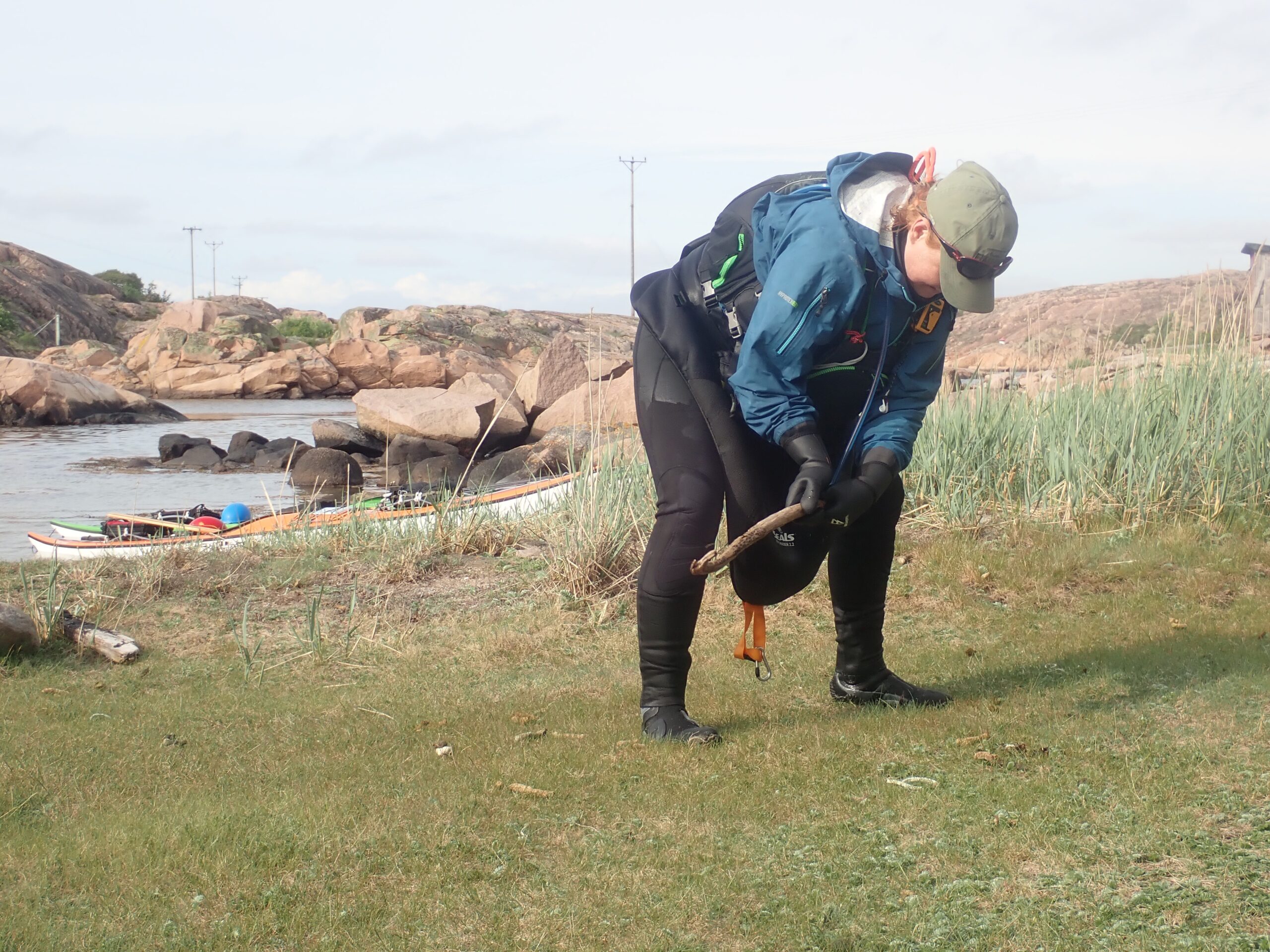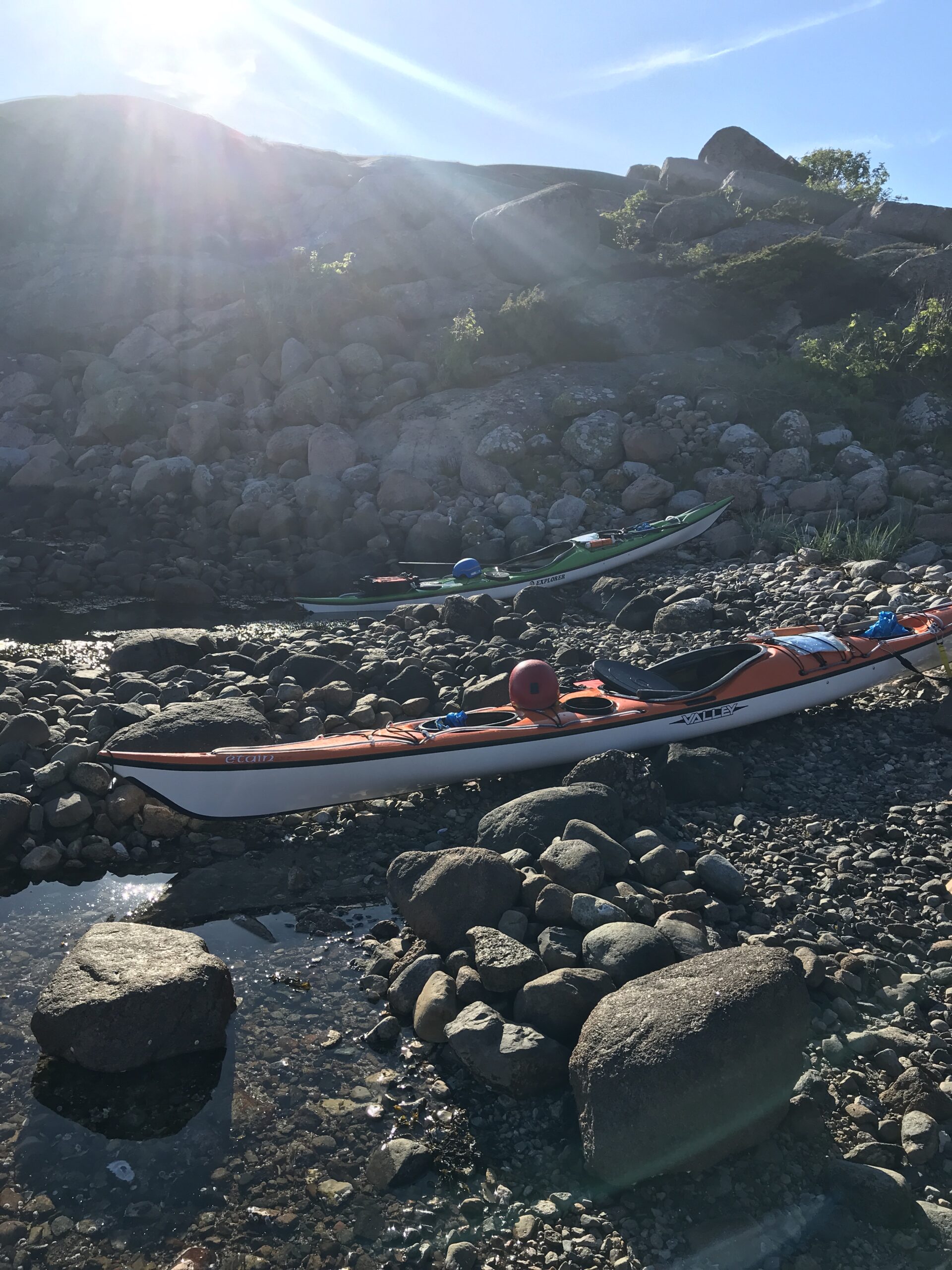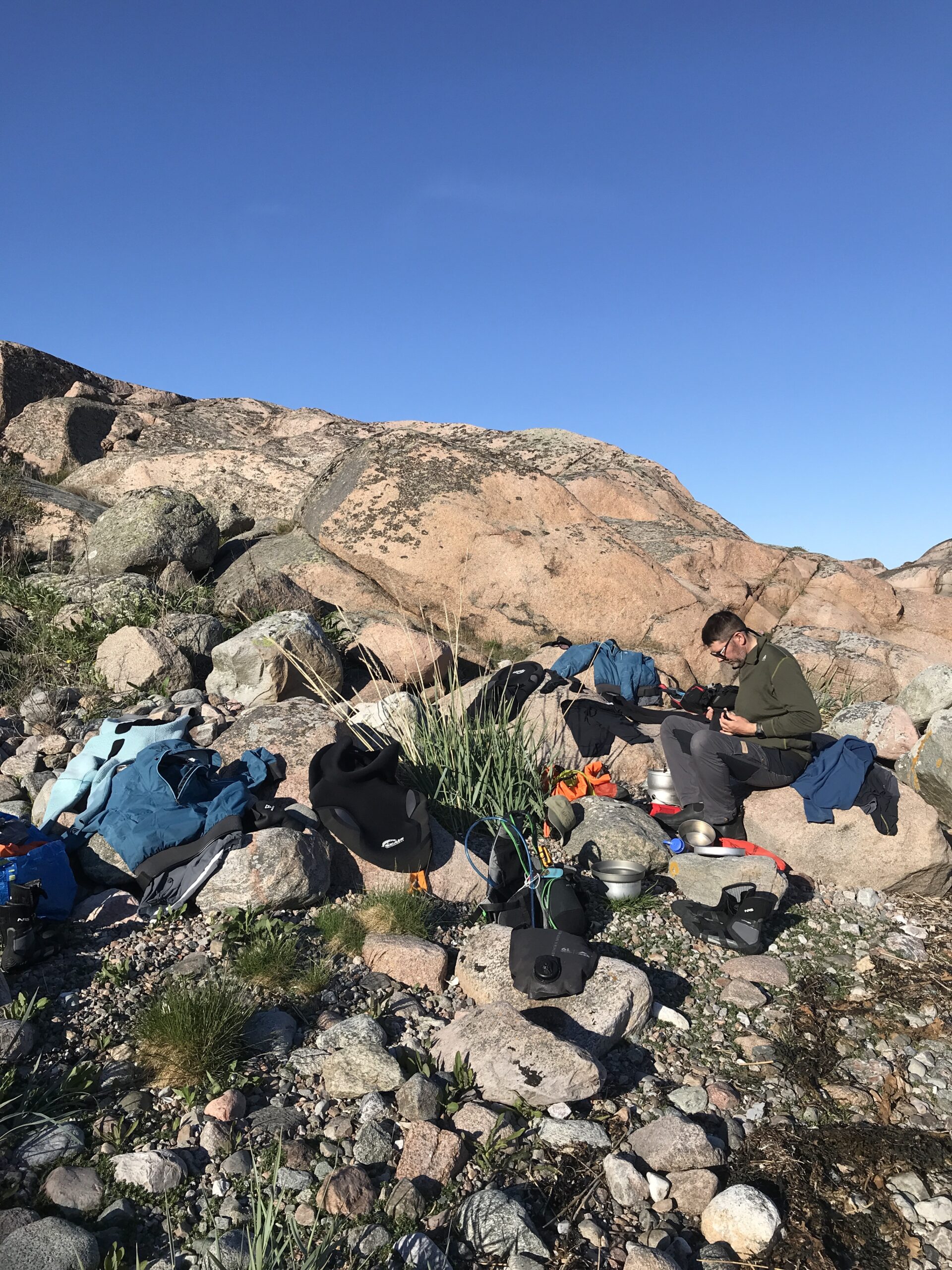 Vi holdt aftenpause på et mindre skær, selvom det ikke var optimale landgangsforhold. Vi bruger et par kæppe for at skåne kajakkerne. Det er ikke alle der vil trække deres glasfiber kajakker over sten, sand, grus og granit, men vi er på tur, kajakkerne skal bruges og vi passer så godt på vi kan. Vi fik tørret tøjet lidt, lavet aftensmad og nydt udsigten.