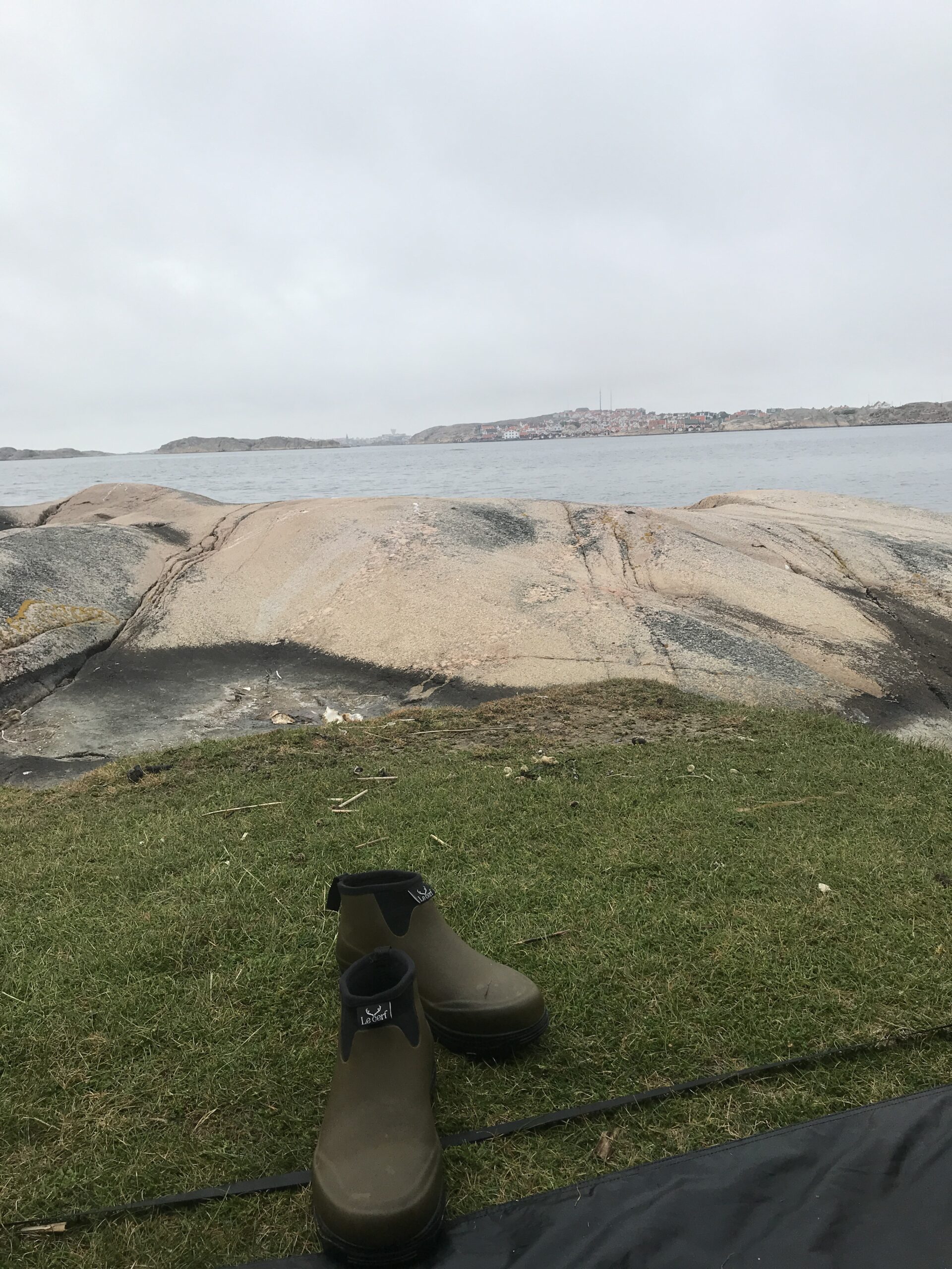 Onsdag starter med regn og lidt mindre vind. Vi følger vejrudsigten, så vi kan komme til Grebbestad og proviantere. Efter frokost tog vi vores våde ro-tøj på og satte ud i regnen. Det krævede lidt overtalelse inde i det varme telt. Vejret og turen trak ligesom ikke rigtigt. Blæsten var heldigvis ikke så slem, så det endte faktisk med at blive en helt god tur ind til Grebbestad og dejligt lige at få rettet ryggen efter et døgn i teltet. Det blev til 9,1 km i dag.