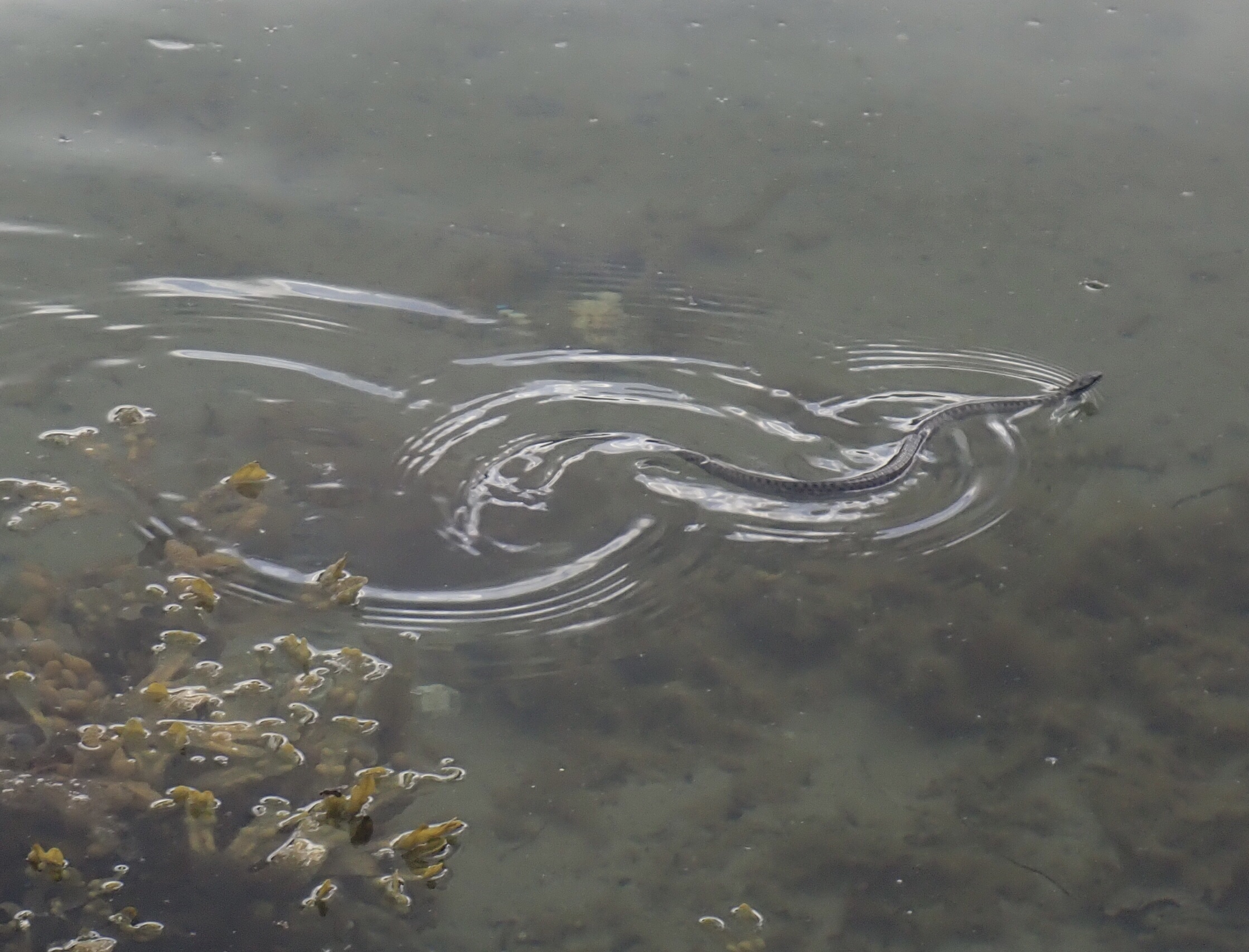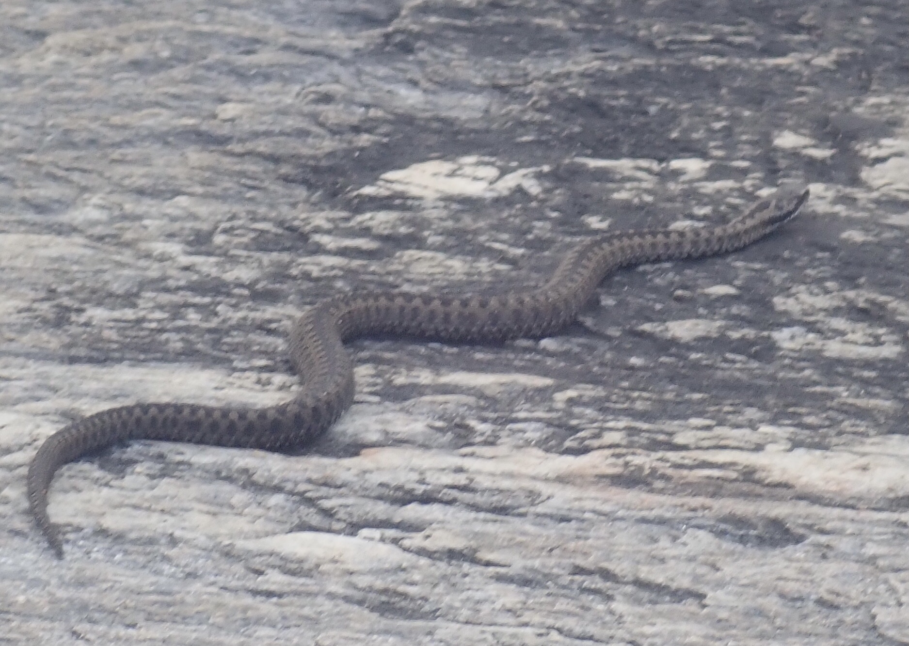 Inden afgang da kajakkerne var pakket og Lars lige skulle tjekke pladsen, så han en hugorm på stenen lige ved siden af hvor teltet havde stået. Den var super fin og vi fik et par gode billeder af den både hvor den ligger på stenen og hvor den svømmer væk fra os. Det er faktisk lidt en oplevelse at være så tæt på en hugorm. Fascinerende dyr. Vidste du, at den blandt andet føder levende unger?!
