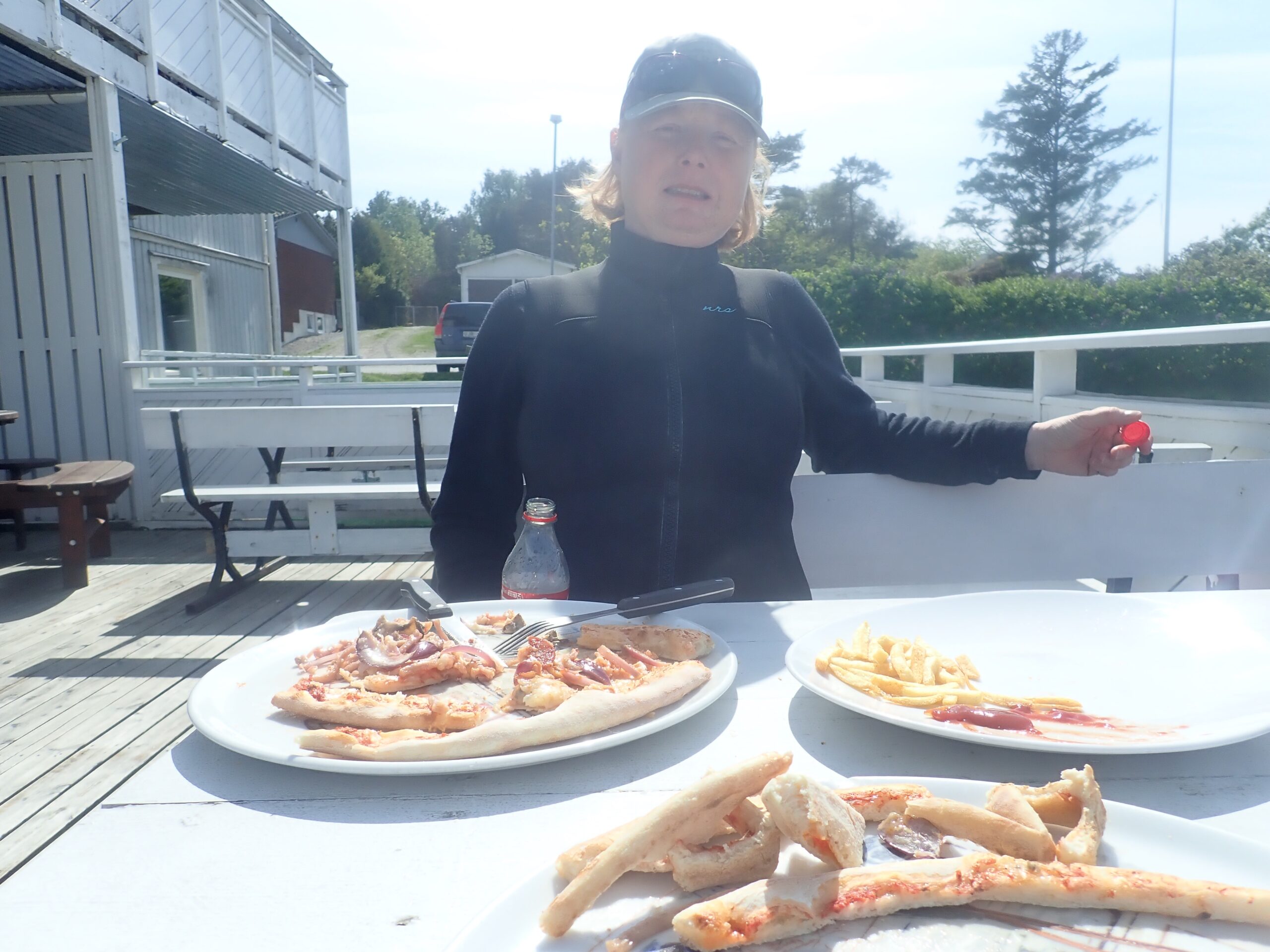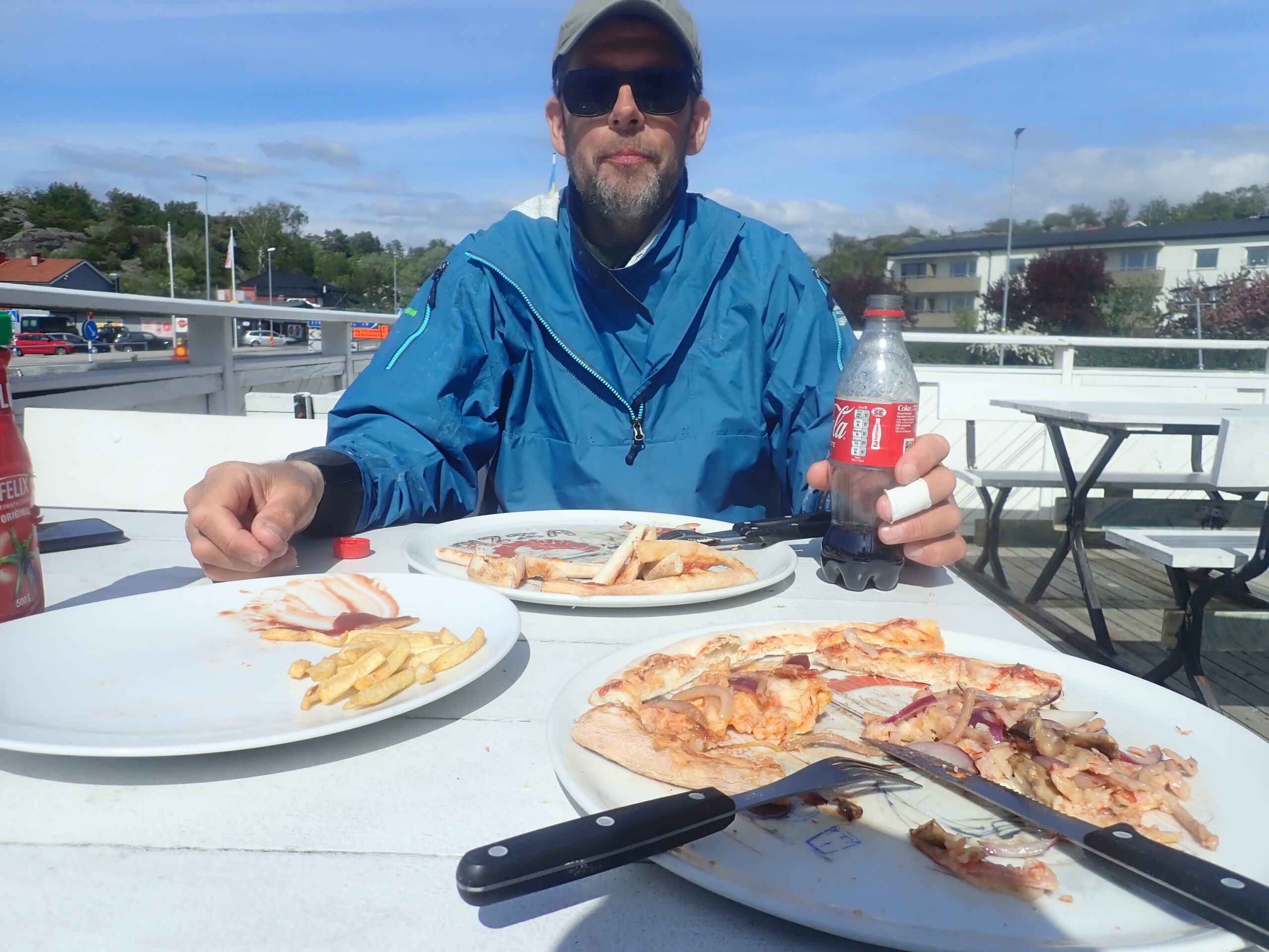 Efter en et stykke med strøm og vind kunne vi dreje ind mod Ellös for at holde pause. Vi havde kun roet 7 km men det føltes som en del mere, så vi mente vi havde fortjent en frokost. Der er ikke meget i de svenske kystbyer der er åbent i maj, men vi fandt et pizzaria ved siden af dagligvarebutikken. Så vi flottede os med både pizza, cola og pommes. Det smagte virkelig godt efter over 2 uger med tørret mad, rugbrød med figenpålæg eller makrel og havregryn. Selvom kosten er god og nærende kan den godt blive lidt ensformig.