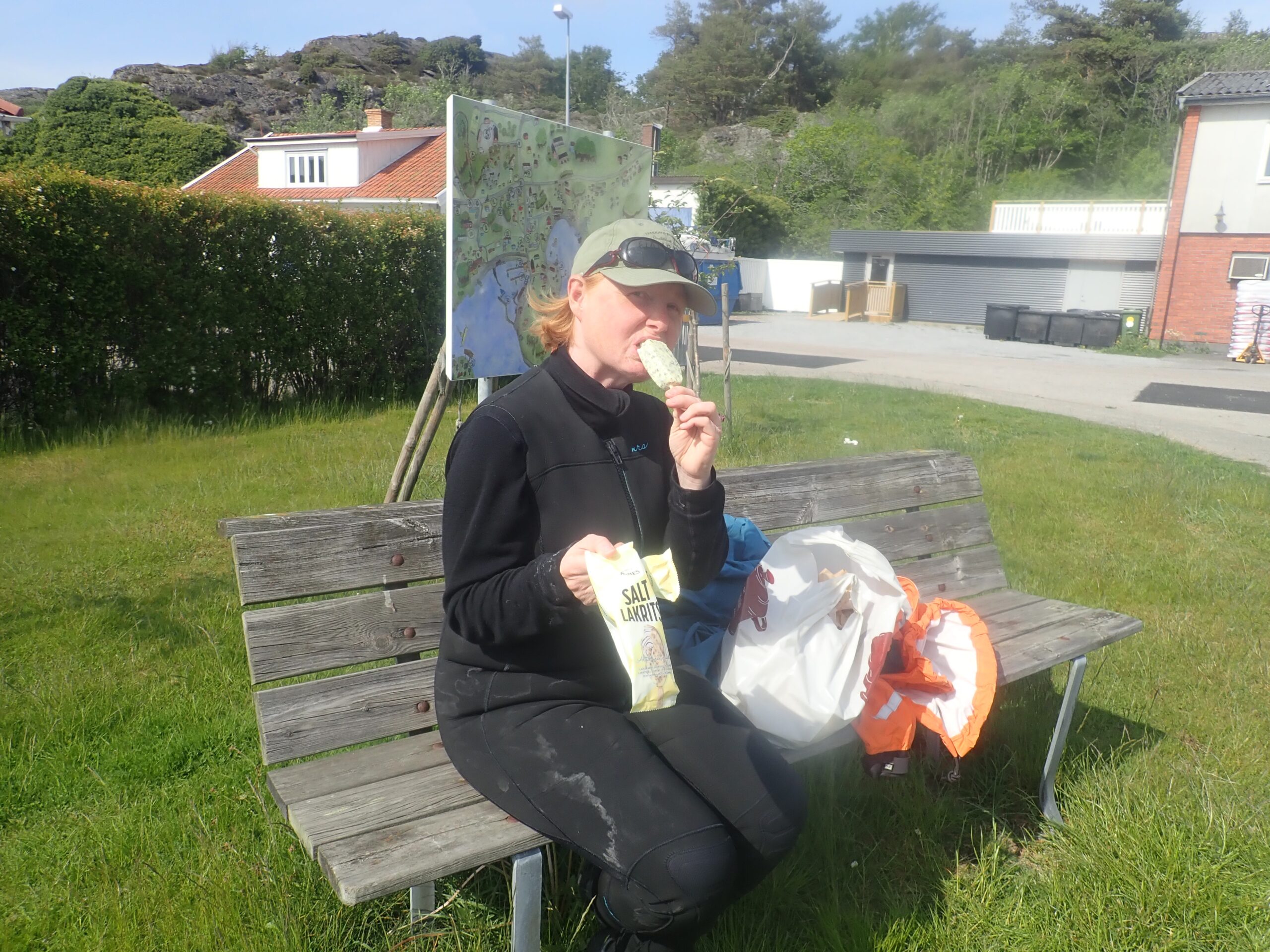 Søndag padlede vi mod Lysekil, hvor vi fik en is i en dykker forretning. De havde ikke Farbror Arne, så vi måtte nøjes med en vaffel 🙂 Vi orkede ikke gå ind mod centrum, da det faktisk var en halvstor by. Vi havde fundet et ok parkerings-spot på en lav bro i lystbådehavnen ved det gamle havnebad. Det er som sagt ofte en udfordring at finde et landingssted i de større havne.