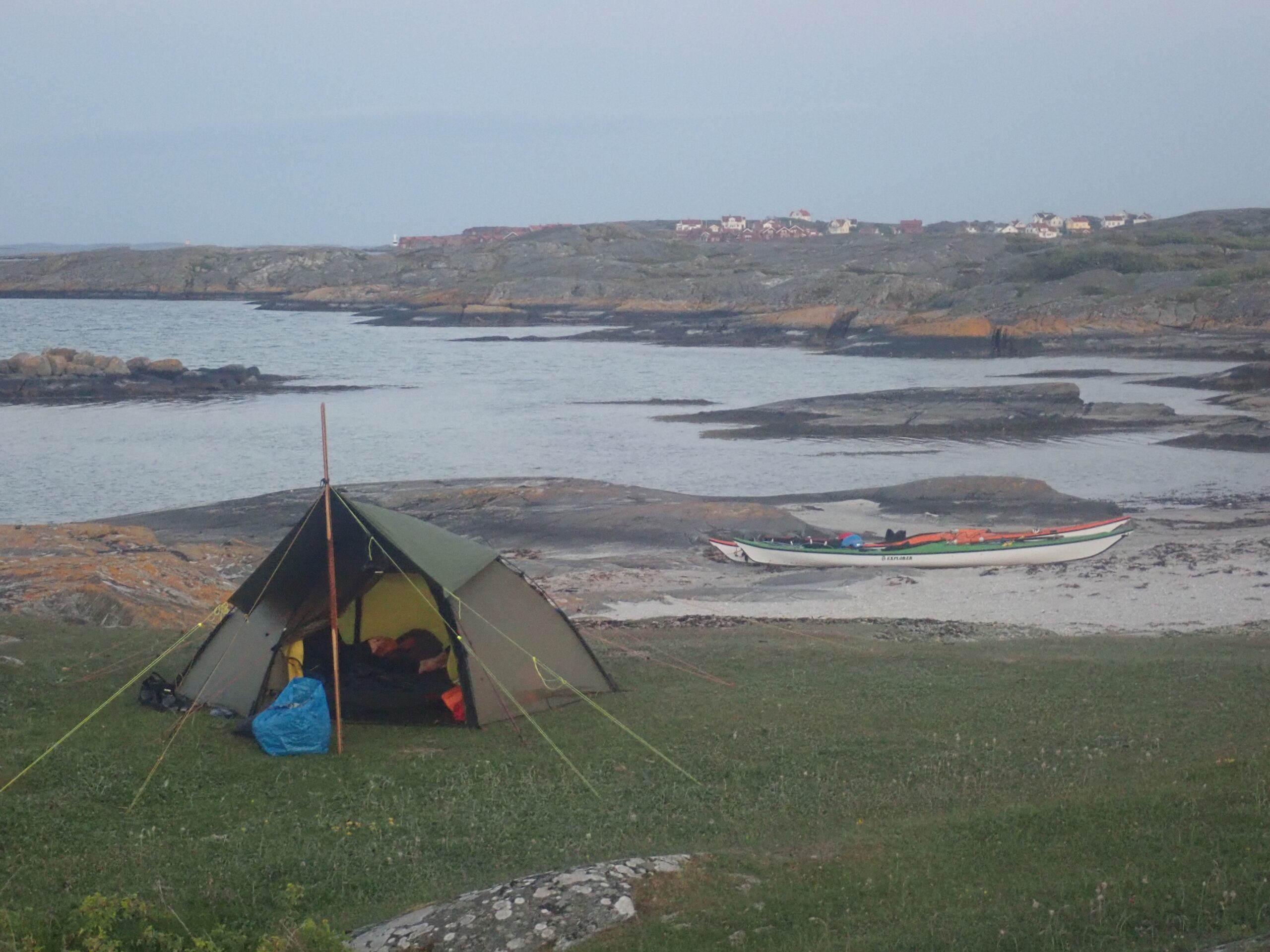 Så var vi klar til at ro lidt igen og vi satte ambitionen lidt højere end vi havde satset på om formiddagen, så målet blev Vallerö tæt på Käringön. Det gav lidt 12 km mere i godt og vel modvind hele vejen, men vi nåede frem i fin stil. Fik sat lejr og snakket med en dame fra Käringön, der havde taget sin båd over for at gå aftentur. Det var umiddelbart lidt specielt, at hun sådan tog båden for at gå aftentur, men på den anden side tager vi jo også gerne bilen for at gå en tur i skoven. Hun bruger jo blot vandvejen. Hun inviterede i øvrigt på kaffe, hvis vi tog turen over til Käringön. Vi skal bare spørge efter Emma. Der bor mellem 50-60 mennesker derovre, så de kender hinanden.