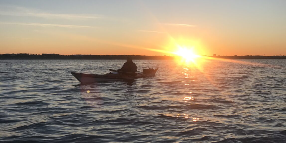 Vejrudsigten var god med udsigt til sol og vind op til 5 sek/m. Strømmen ville være med os ud af Grådyb, hvis vi tog tidligt afsted så vækkeuret blev sat til kl 04.00 så vi kunne nå en færge 05.10 og være klar til at tage vandet ud. Det var lidt koldt med temperaturer omkring frysepunktet og solen var endnu ikke stået op, da vi pakkede kajakkerne på broen ved Esbjerg Roklub. Men det var en smuk og stille morgen, da vi roede ud 06.50 (lige 50 minutter for sent i forhold til vandet, men sådan går det, når morgenkaffen trækker ud)